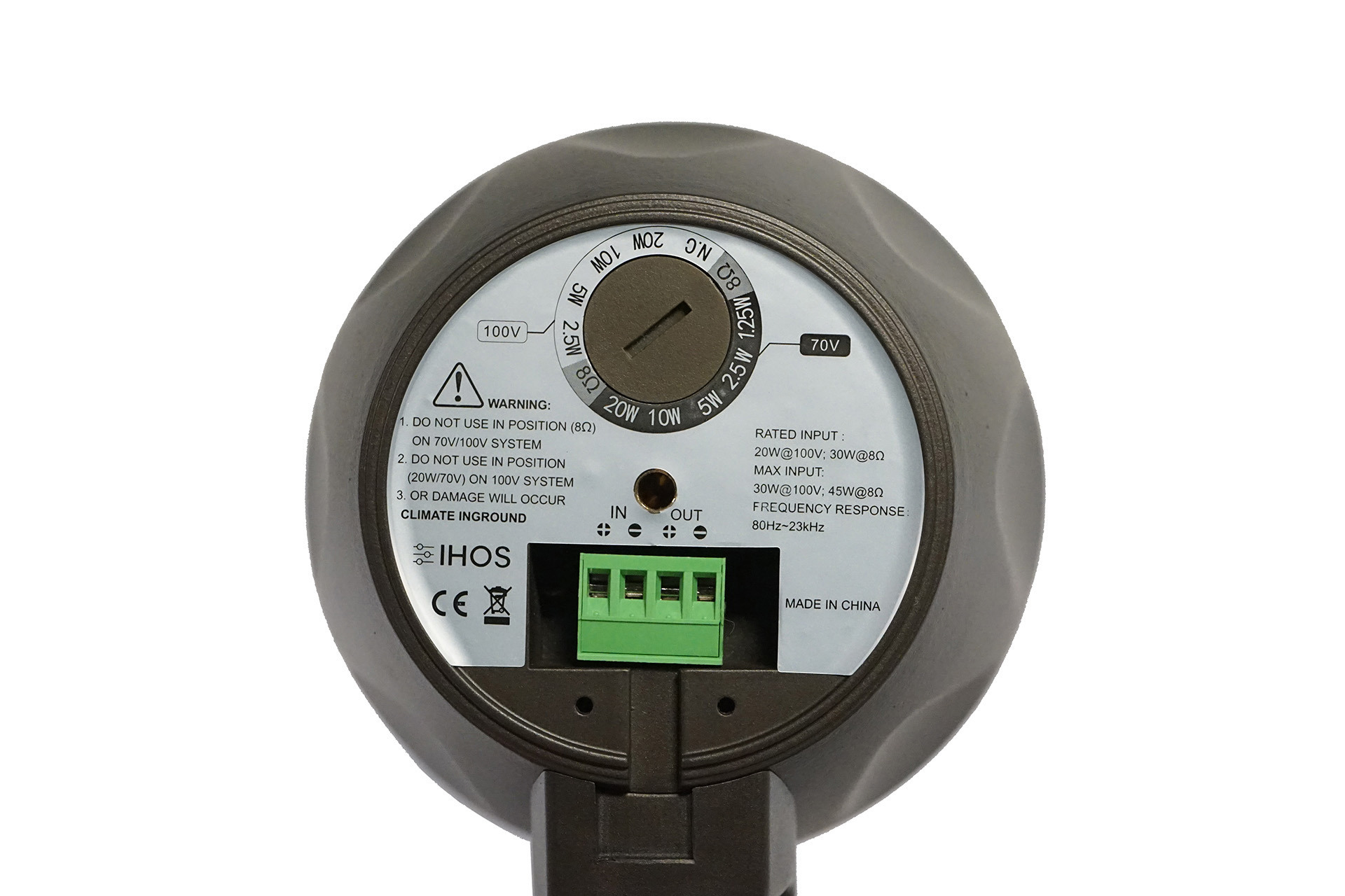 Unidirectional outdoor IP65 speaker, inground, wall mount and hanging mounted, ABS plastic, 100V, 20W/8�, max SPL 105dB, Frequency Response 120Hz-20KHz, Dispersion Angle 170*90 degree, 4″woofer 1« tweeter, 1.6kg