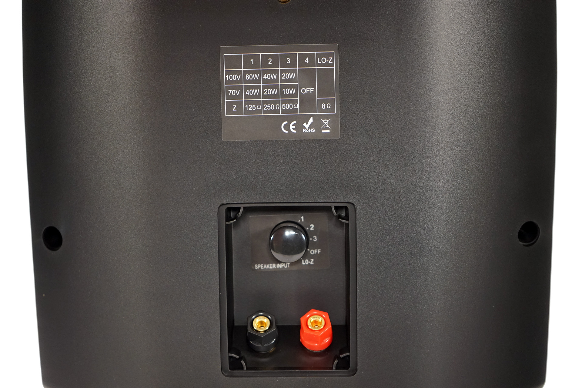 All weather loudspeaker, IP66 waterproof for all extreme outdoor applications, 8″ weatherproof woofer and 1.5? silk tweeter 2-way speaker system, ABS enclosure, stainless metal grille stainless mounting bracket, Supplied with 360� rotatable bracket for horizontal and vertical installation angle adjustment, 70/100V Speaker, max SPL 120dB, Black Housing,4.9kg
