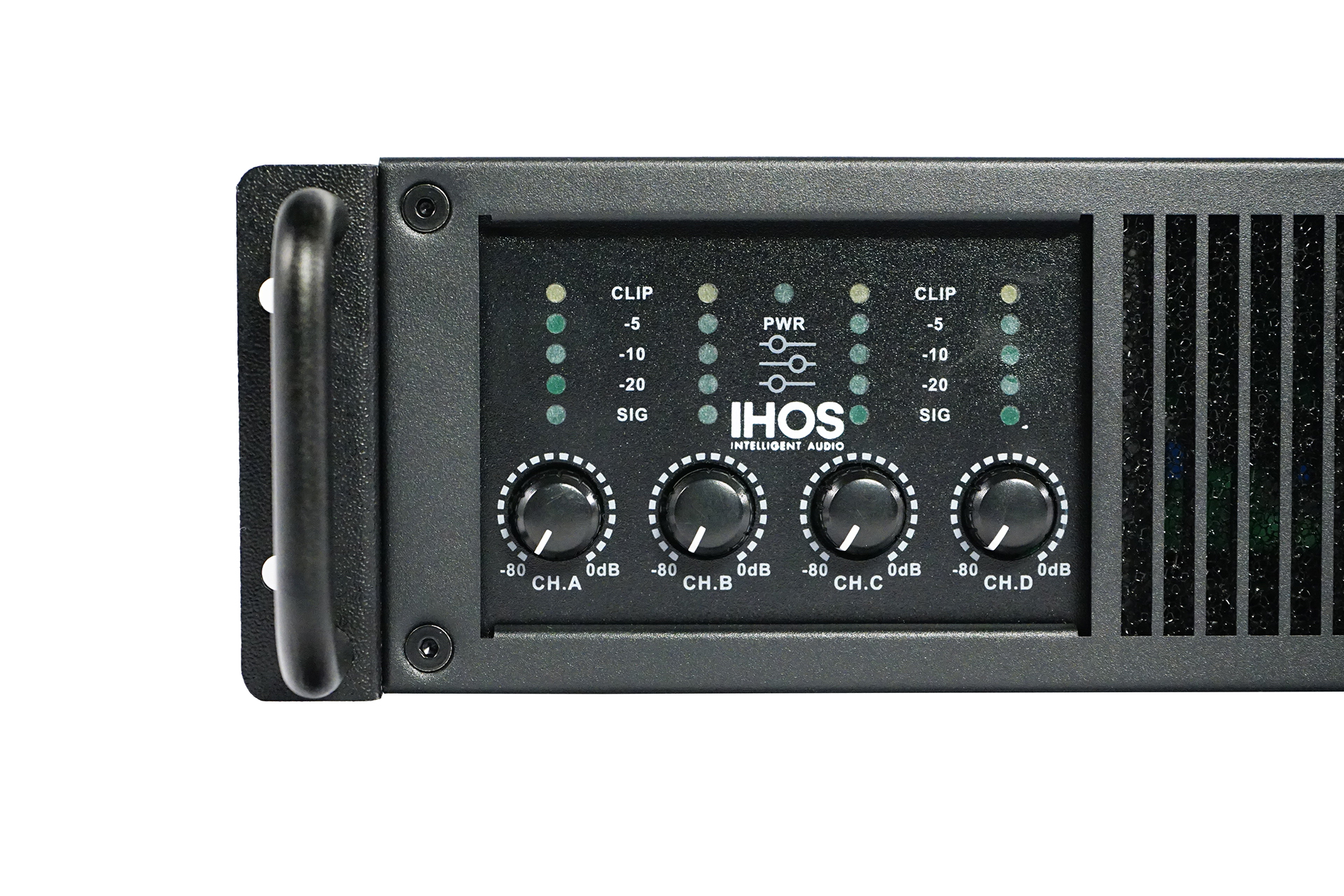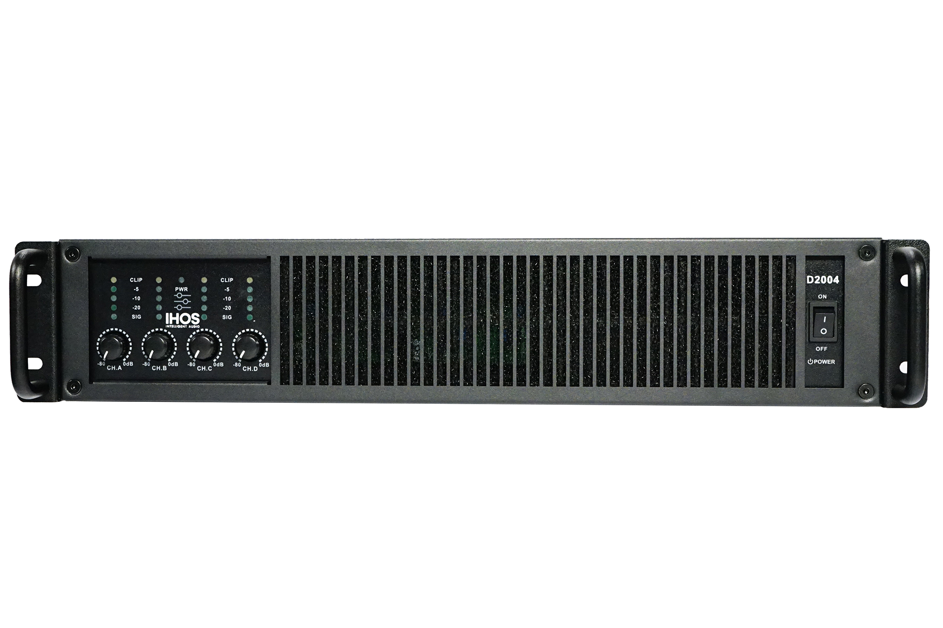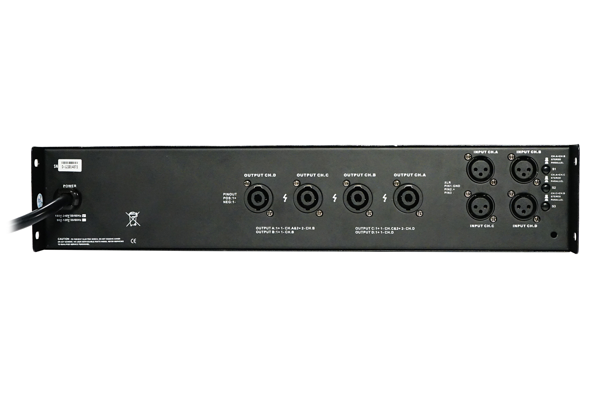 D class high performance 4 channels amplifier, 4 x400 w/8ohms , 4 x 640w/4 ohms, XLR input, speakon output, led VU meter, temperature control fans, frequency responce 20Hz – 34Kz,6kg.