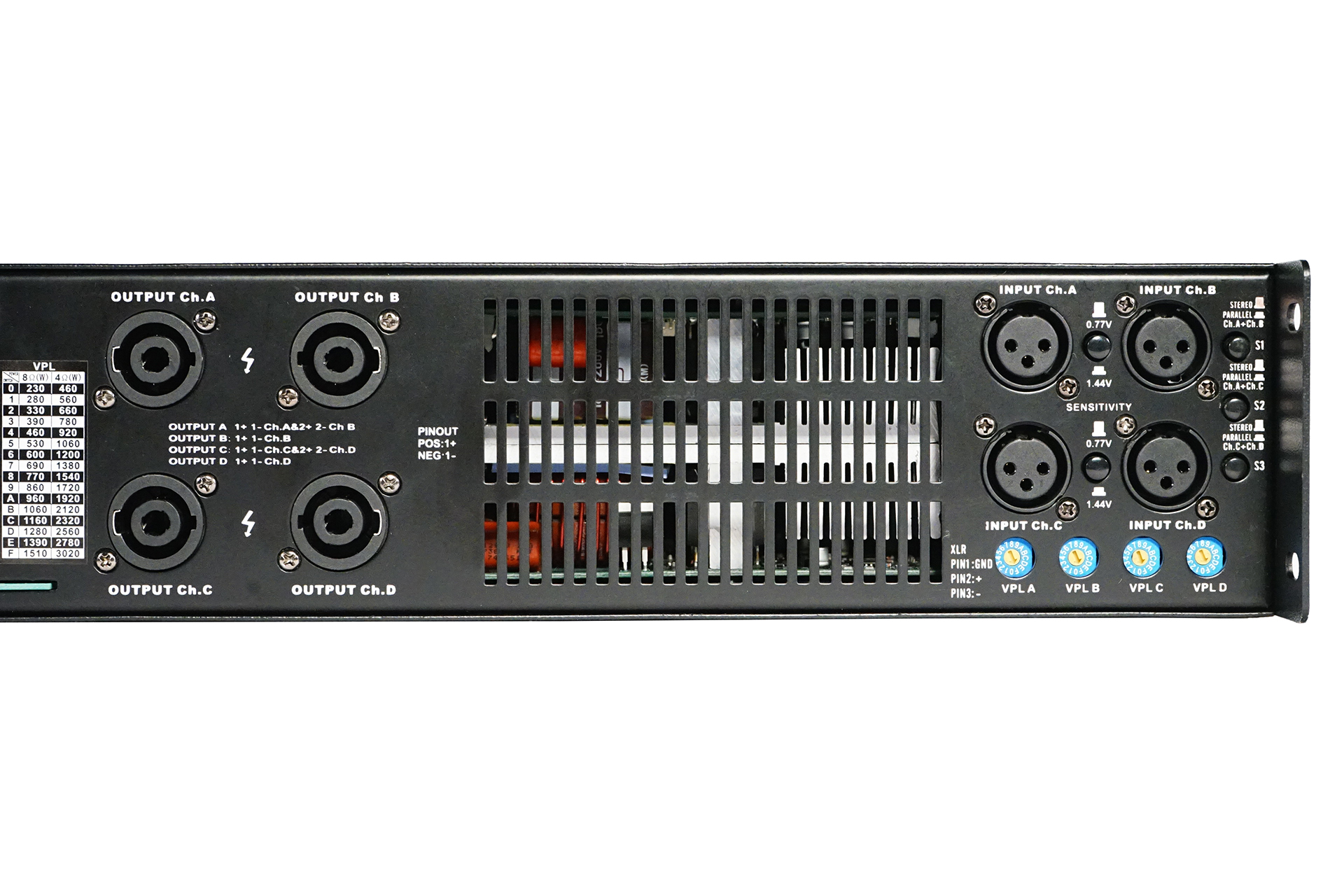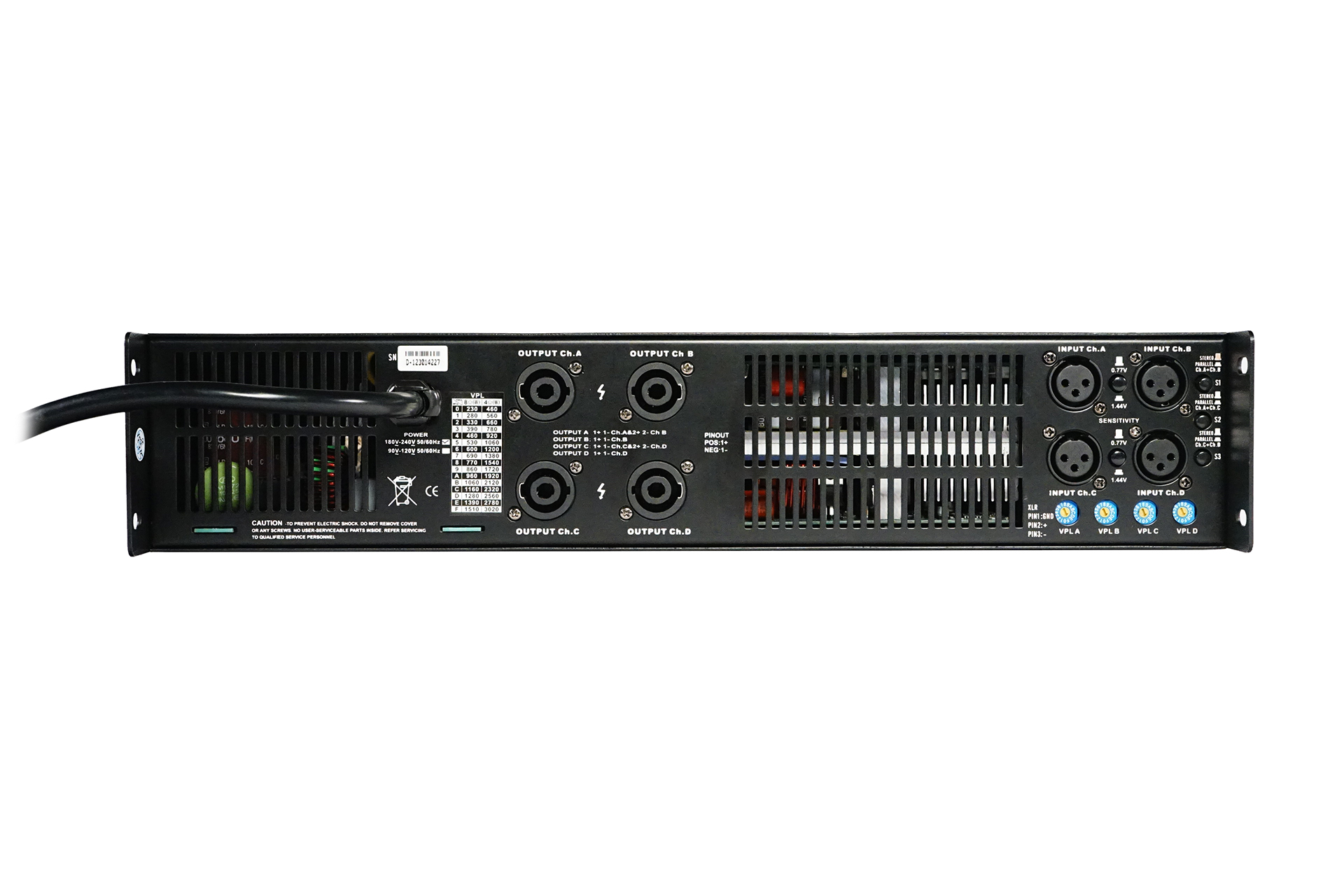 D class high performance 4 channels amplifier, 4 x1500 w/8ohms , 4 x3000w/4 ohms, XLR input, speakon output, led VU meter, temperature control fans, frequency responce 20Hz – 34Kz,adjustable VPL, 13kg.