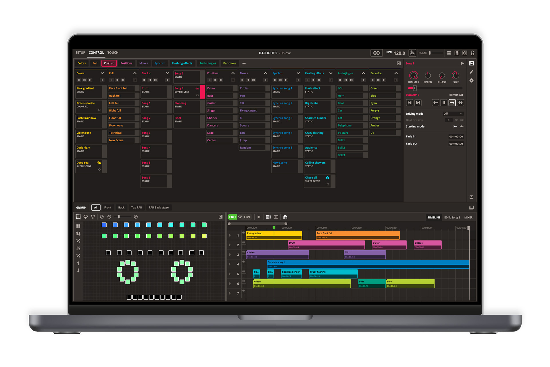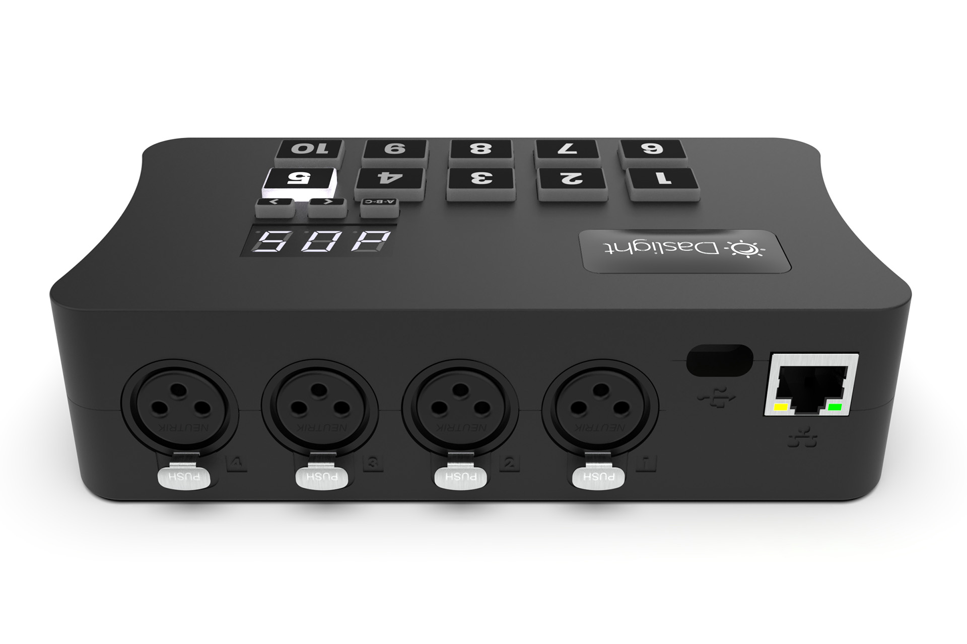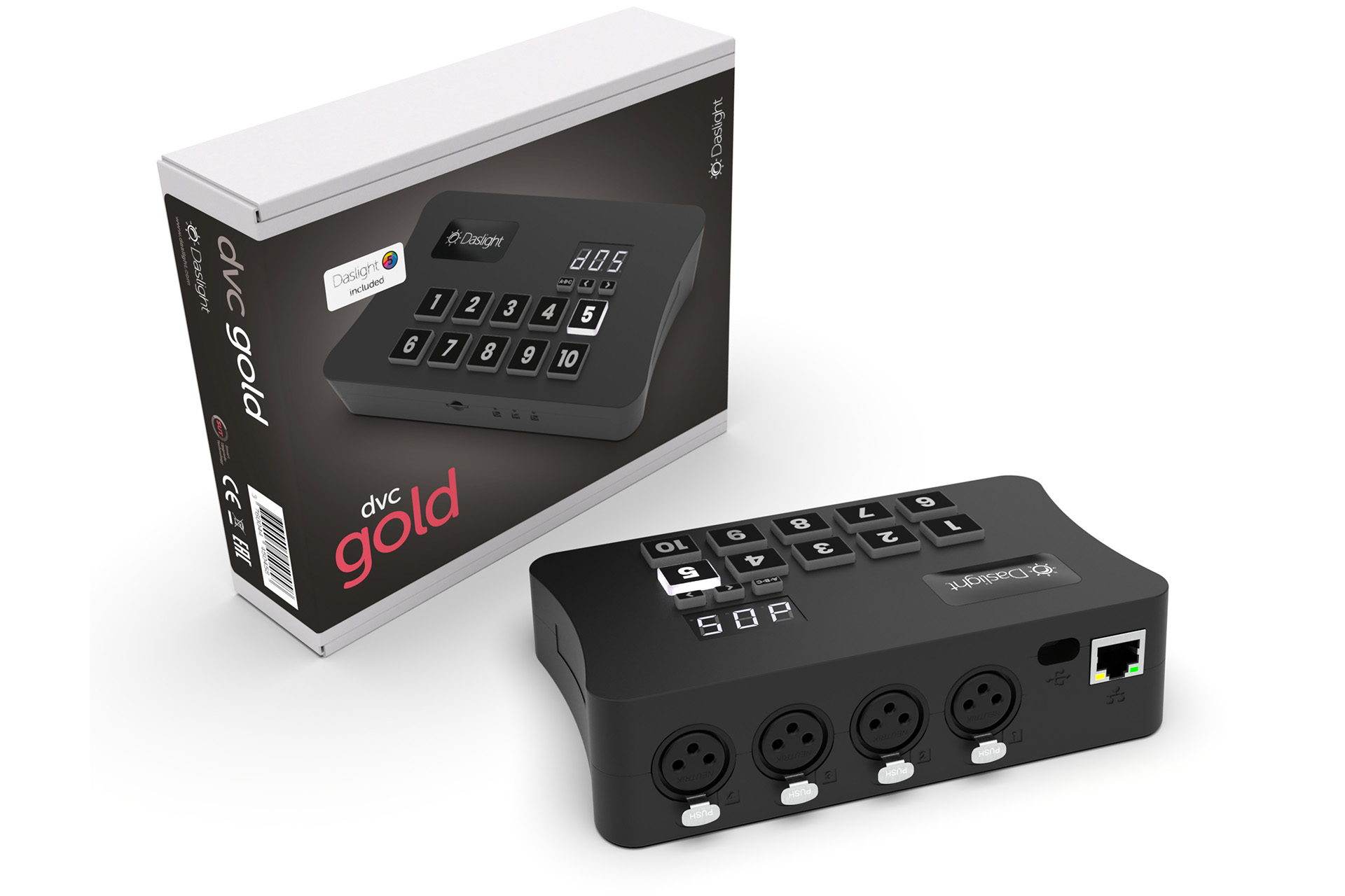 Daslight DVC GOLD, 1024 channels, Sleek design, 1024 DMX OUT channels (2 universes) expandable to 2048 channels and other software supporting the SUT technology (see dmxsoft.com). SD card standalone memory. Works with Daslight 4 and Daslight 5 software. USB-C and ethernet connection. Delivered with a USB-C cable. Power supply for standalone not included. Compatible with Windows 10 11 32/64-bit and macOS 10.15 or higher.