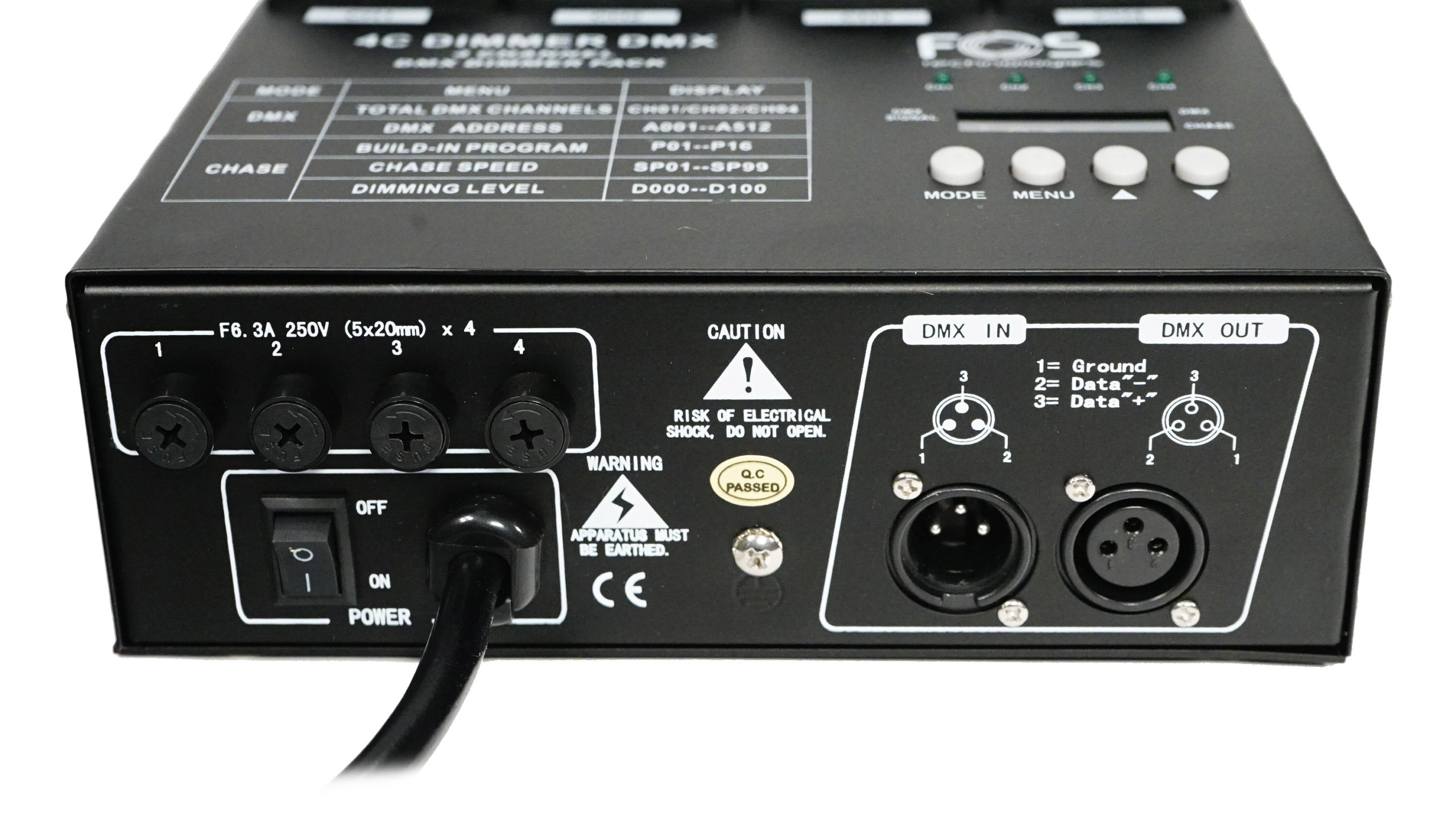 4CH DMX Dimmer Pack , 6.3A/channel, Max.16A totally 4 outlets , Stand-alone chasing function , AC 110-220V/60Hz, weight: 2.7kgs, Unit size: 260 x 190 x 75 mm.