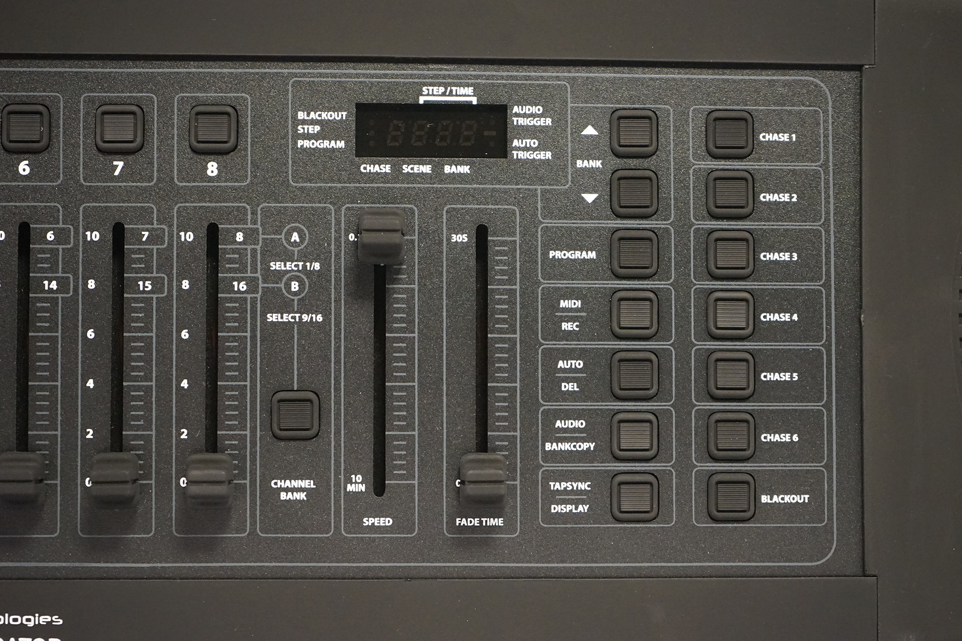 Dmx lighting desk,Control up to 192 DMX Channels, Control up to 12 Separate DMX intelligent lights with up to 16 DMX channels per fixture,Record up to 6 chases with separate fade times and step speeds , 8 individual faders.