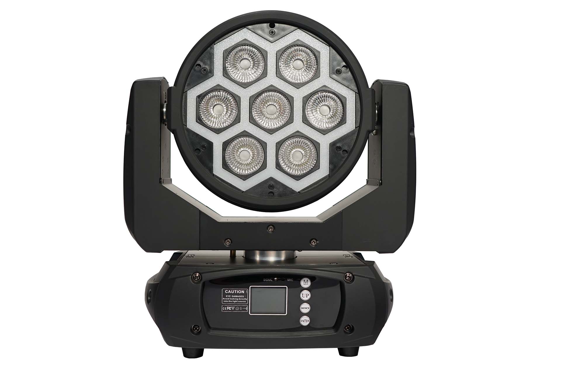 Moving Par wash moving head, 7×12 watt RGBW 4in1 led and 60 SMD Leds 0.2watt RGB, DMX 512 23/28 channels, 16 bit Pan/Tilt movement, Neon Pixel Control , CTB and CTO 2800K-8000K changeable, Built I programs , 0-100% electronic dimming, powercon in/out