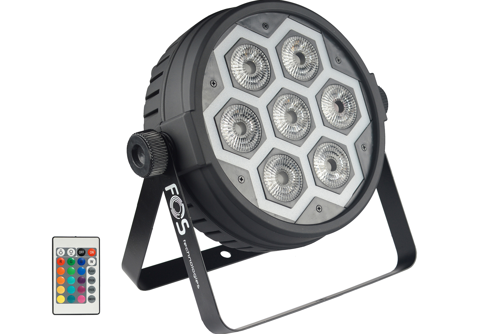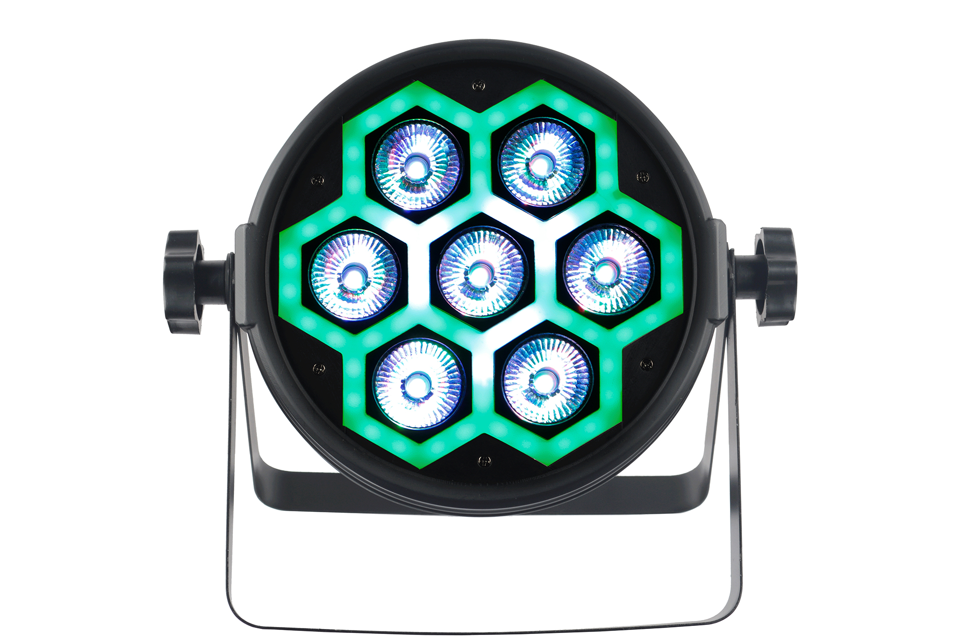 Latest technology Led Par with NEON effect, 7×12 watt 4in1 RGBW leds 60 x 0.2watt RGB leds for the neon pixel effect, 26 degrees beam angle, IR remote ,CTB and CTO linear colour temperature, Bult in prorgams, powercon in/out, 2.2kg
