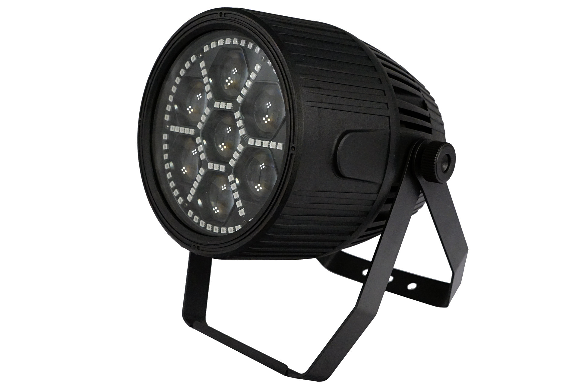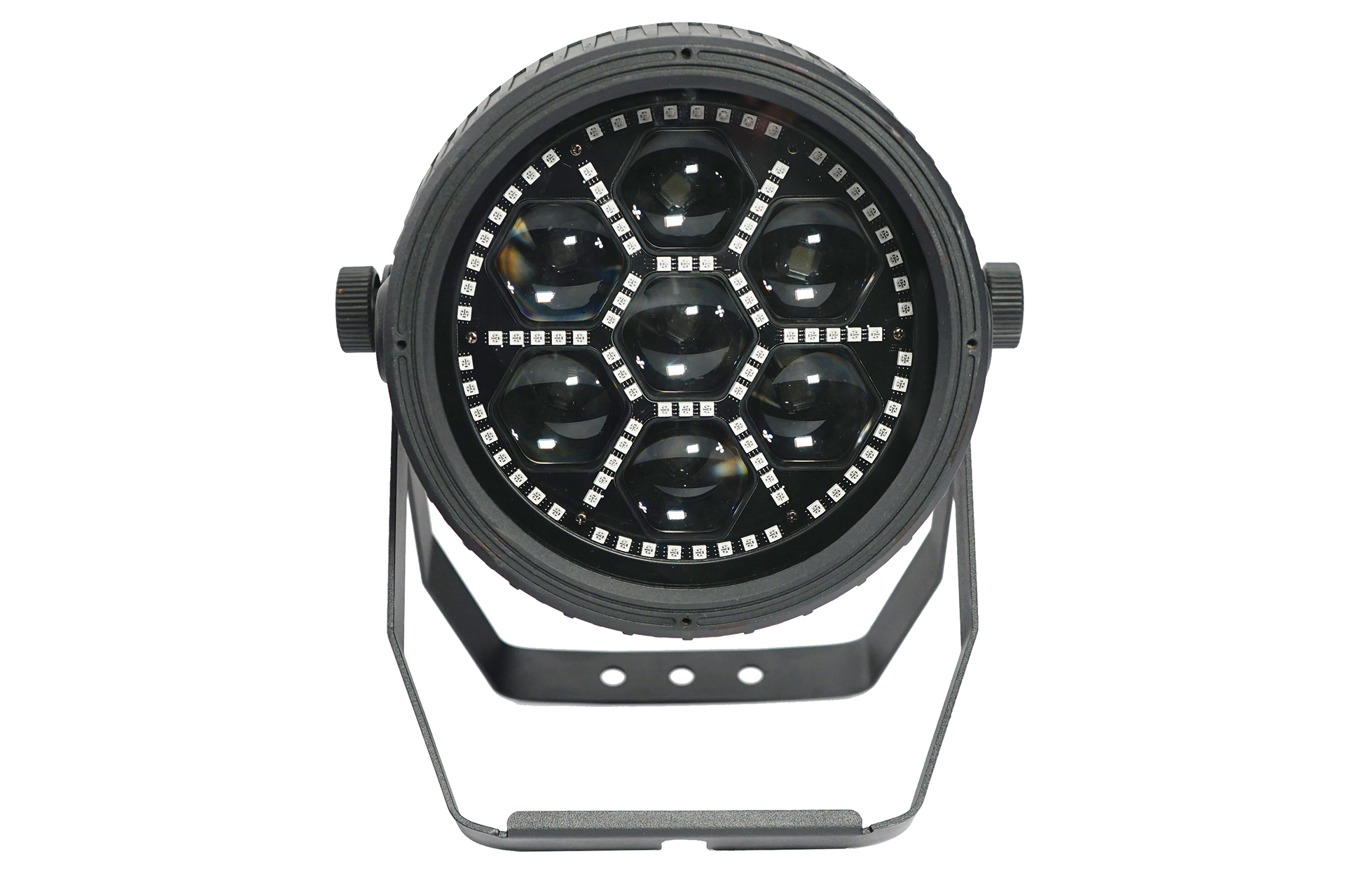 Weatherproof Led par IP65 with seetronic power in out , 7 leds 30watt 4in1 RGBW + 96leds 0.2watt UV, Zoom 3-60 degrees , DMX Channel: 6/9CHs ,0-100% dimmer, 8 kg.