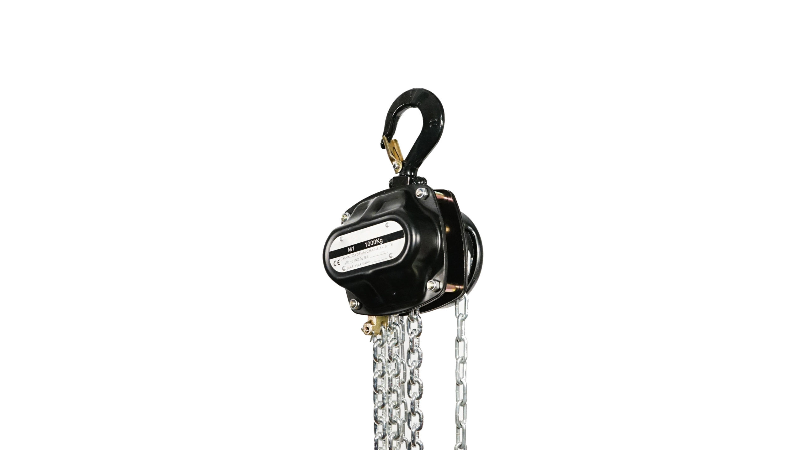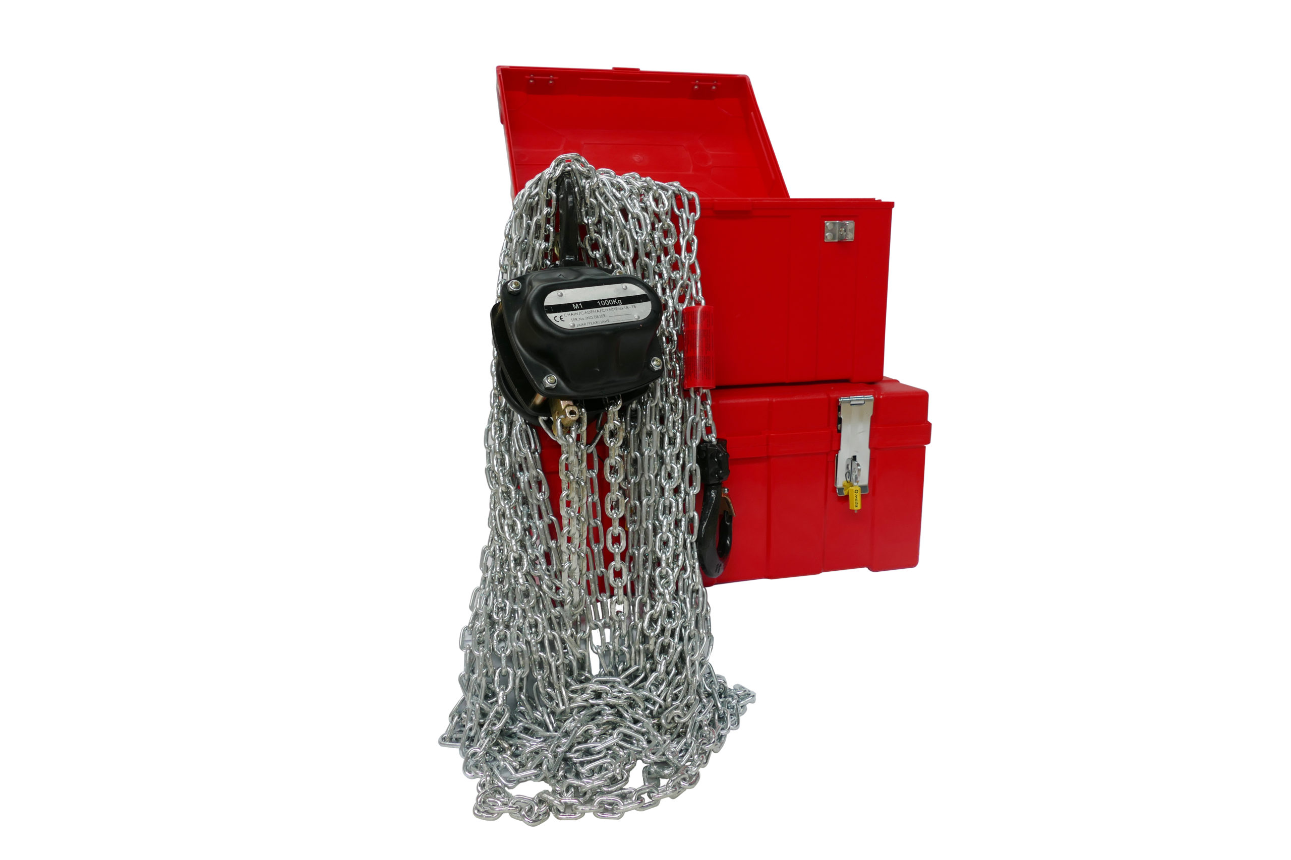Red box with 2 pcs CE certified manual chain hoists with 9m chain and 1000 kg lifting capacity.
