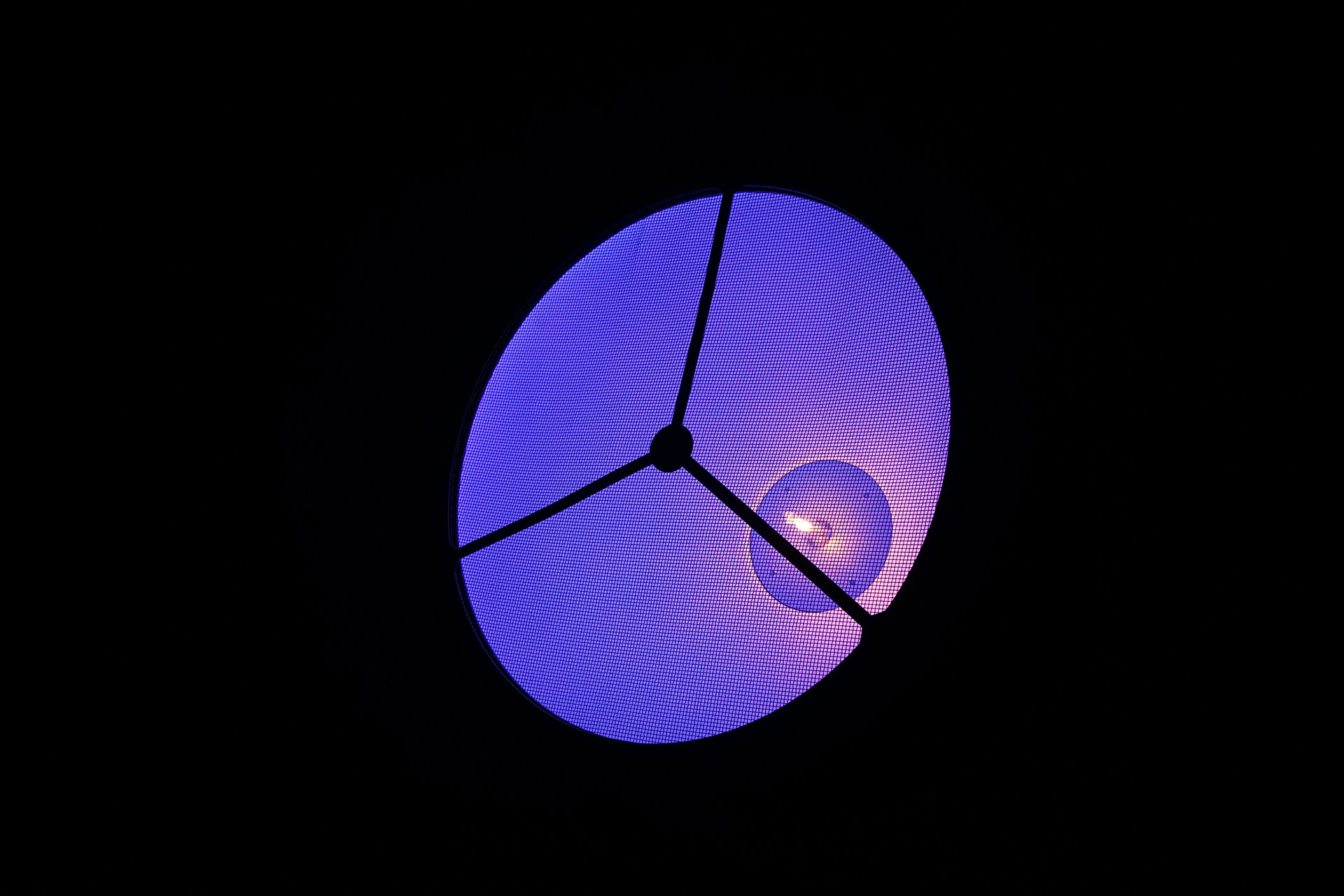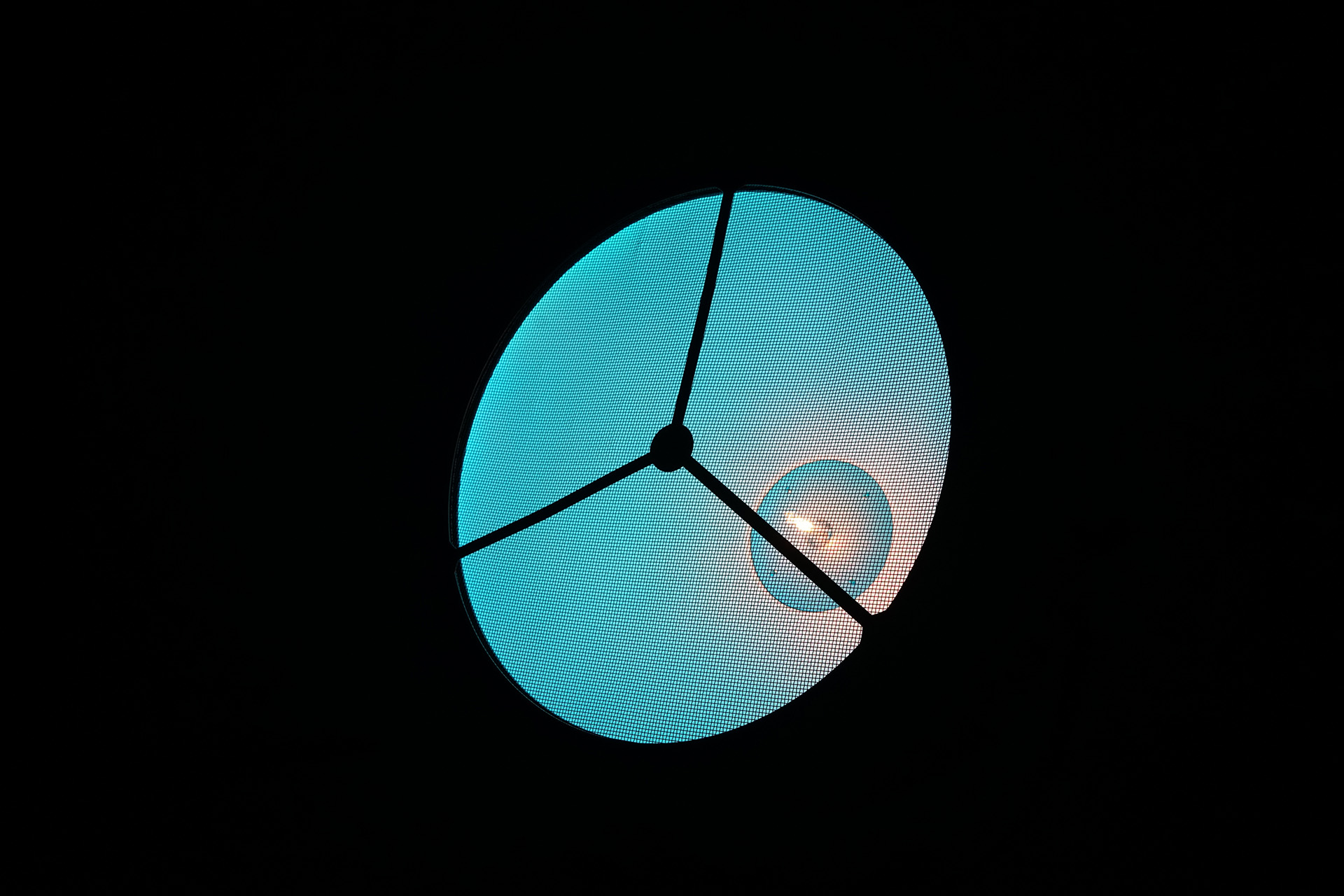 Retro backround fixture, diameter 64cm, 750 watt halogen lamp drived by internal dimmer, 96pcs 3in1 RGB LEDs backround lighting, 4?6?9 DMX channels, Aluminum alloy housing, Lcd menu display,5pin and 3pin XLR, powercon in/out, floor stand,639x330x661 mm 7.5kg.
