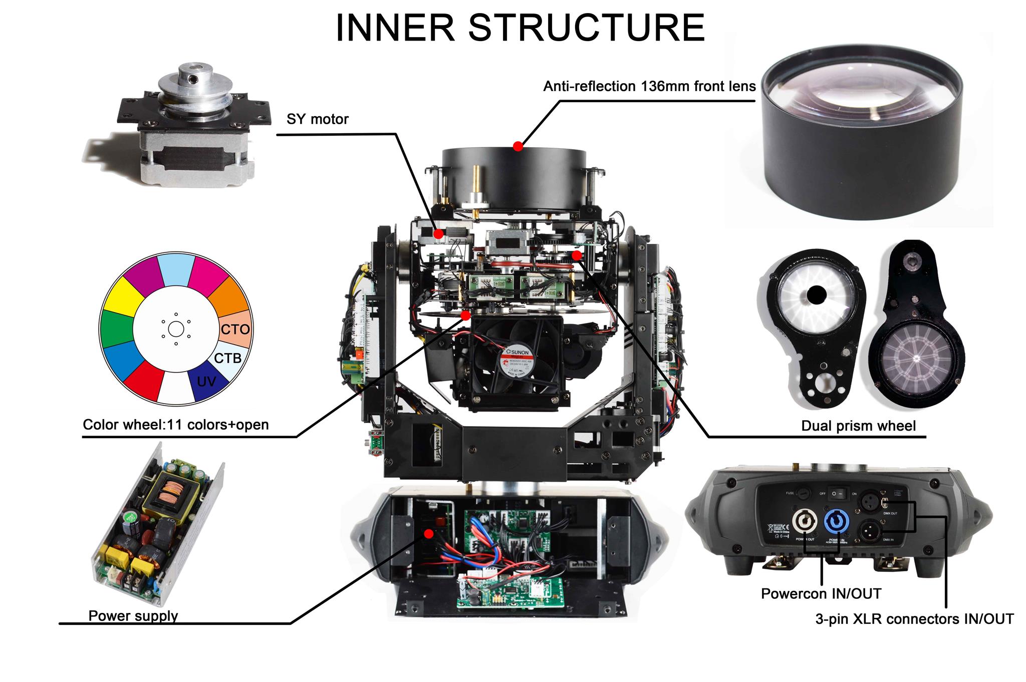 Professional Beam with Super Prisms (16 facet+24 facet prism) and powerful, ultra bright OSRAM 7R Lamp (2000 hours) , 3 phase P/T motors , Solid Beam angle: 2.5� ,Anti-reflection 136mm front lenses , Control Channel:14/16 DMX ,11 colors , 16 gobos , Frost filter, Motorized focus from near to far (2.5M-30M) , 13.2kgs.