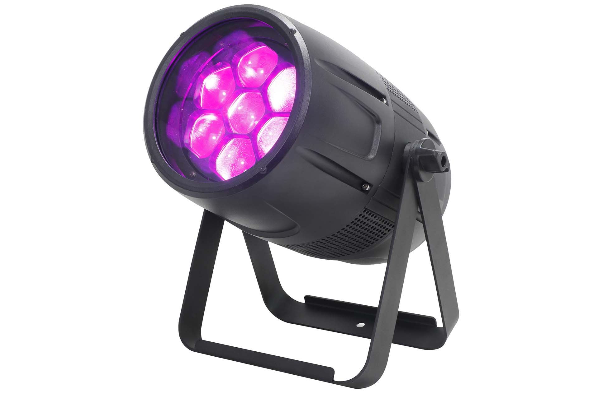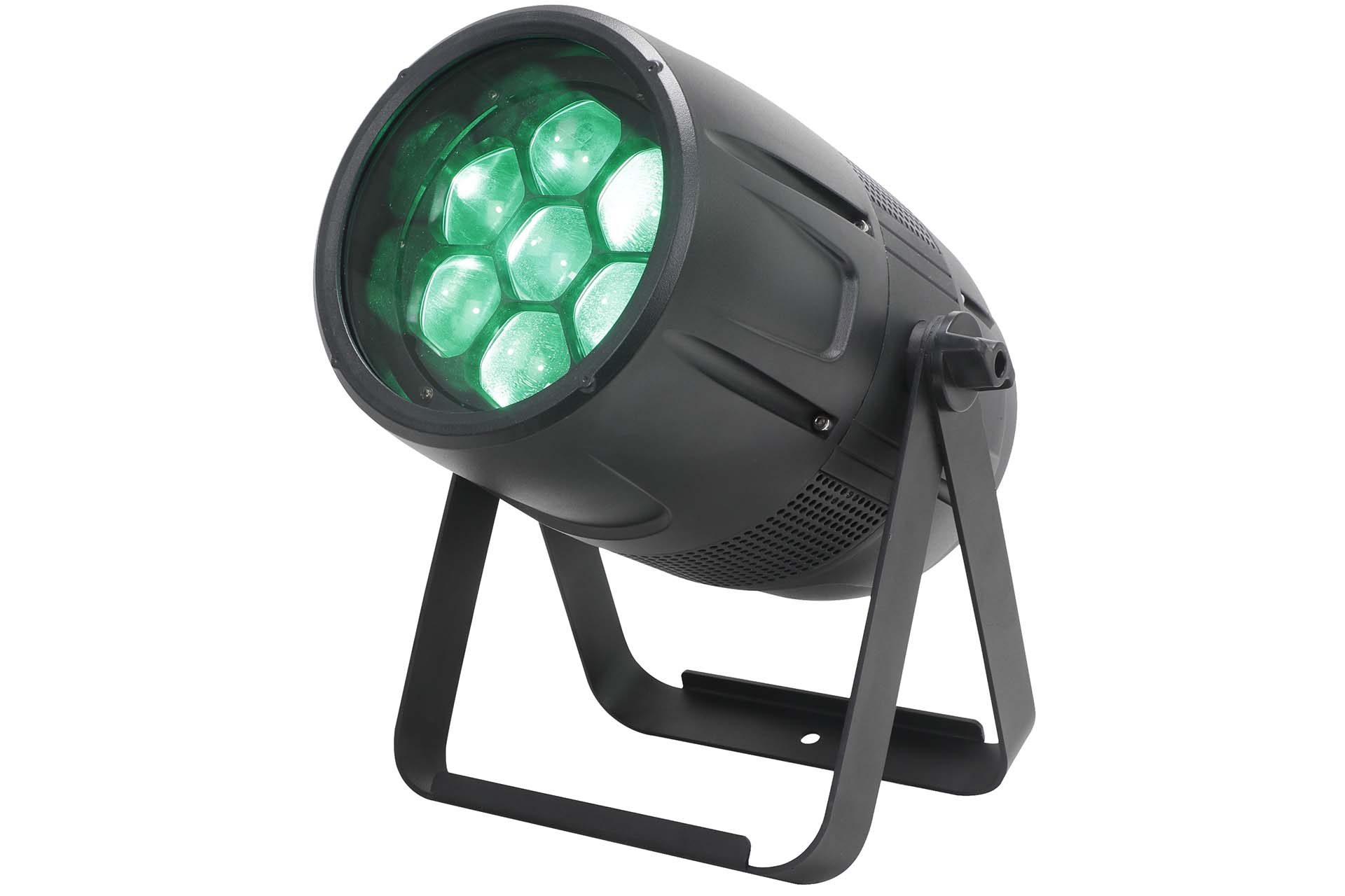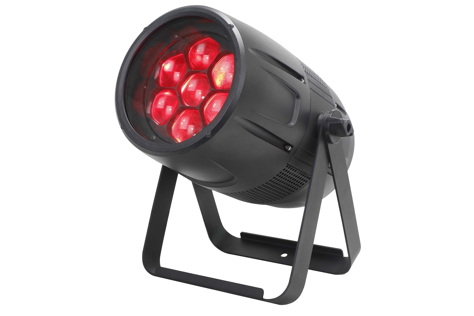Professional IP65 motorized Zoom Par 5-45 degrees, 7 leds 40 watt RGBW 4in1, linear dimmer, 11 channels DMX 512 and RDM control, built in programs, color temperature adjustment, weather proof plugs, aluminum housing, 8 kg.