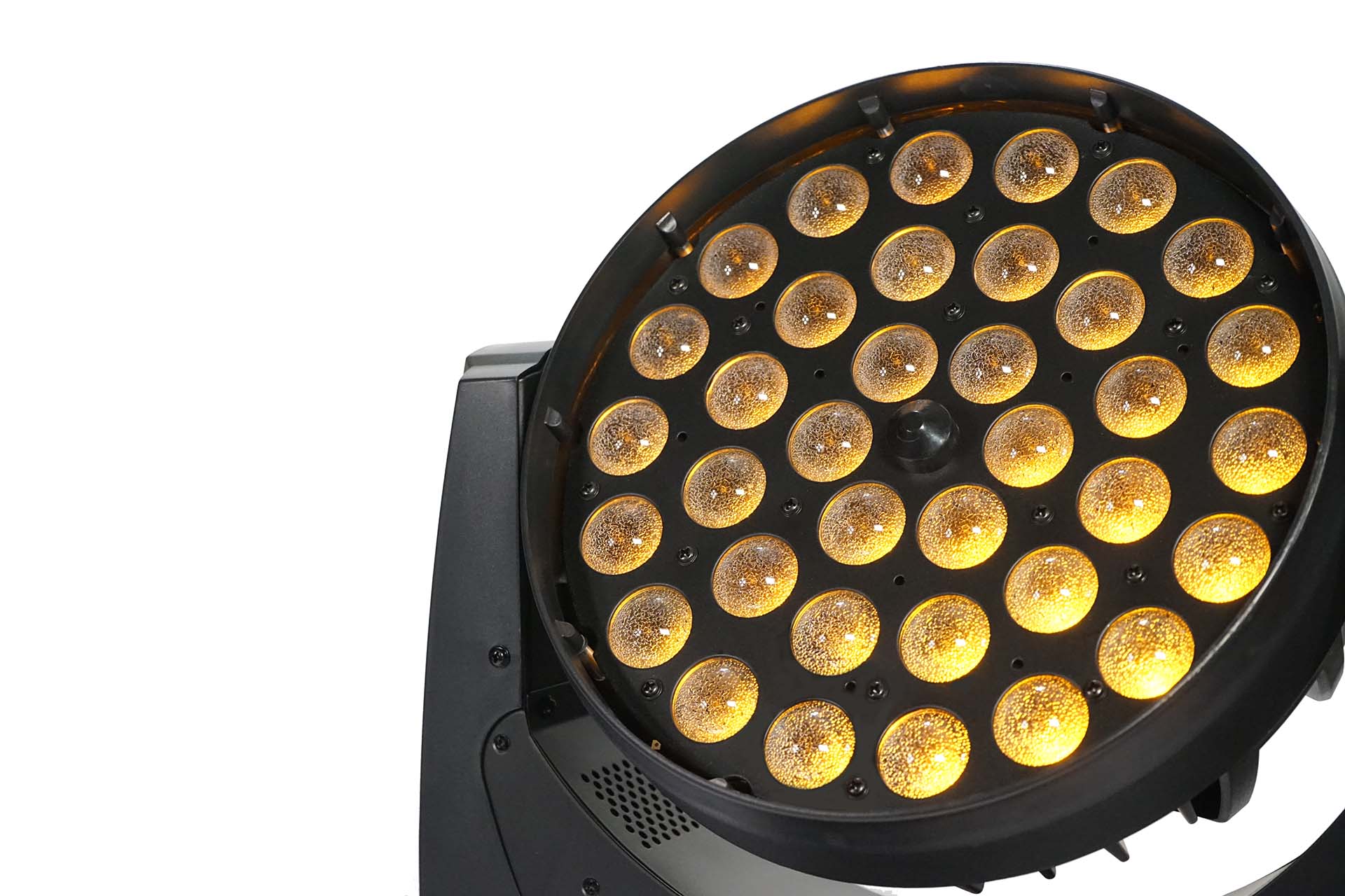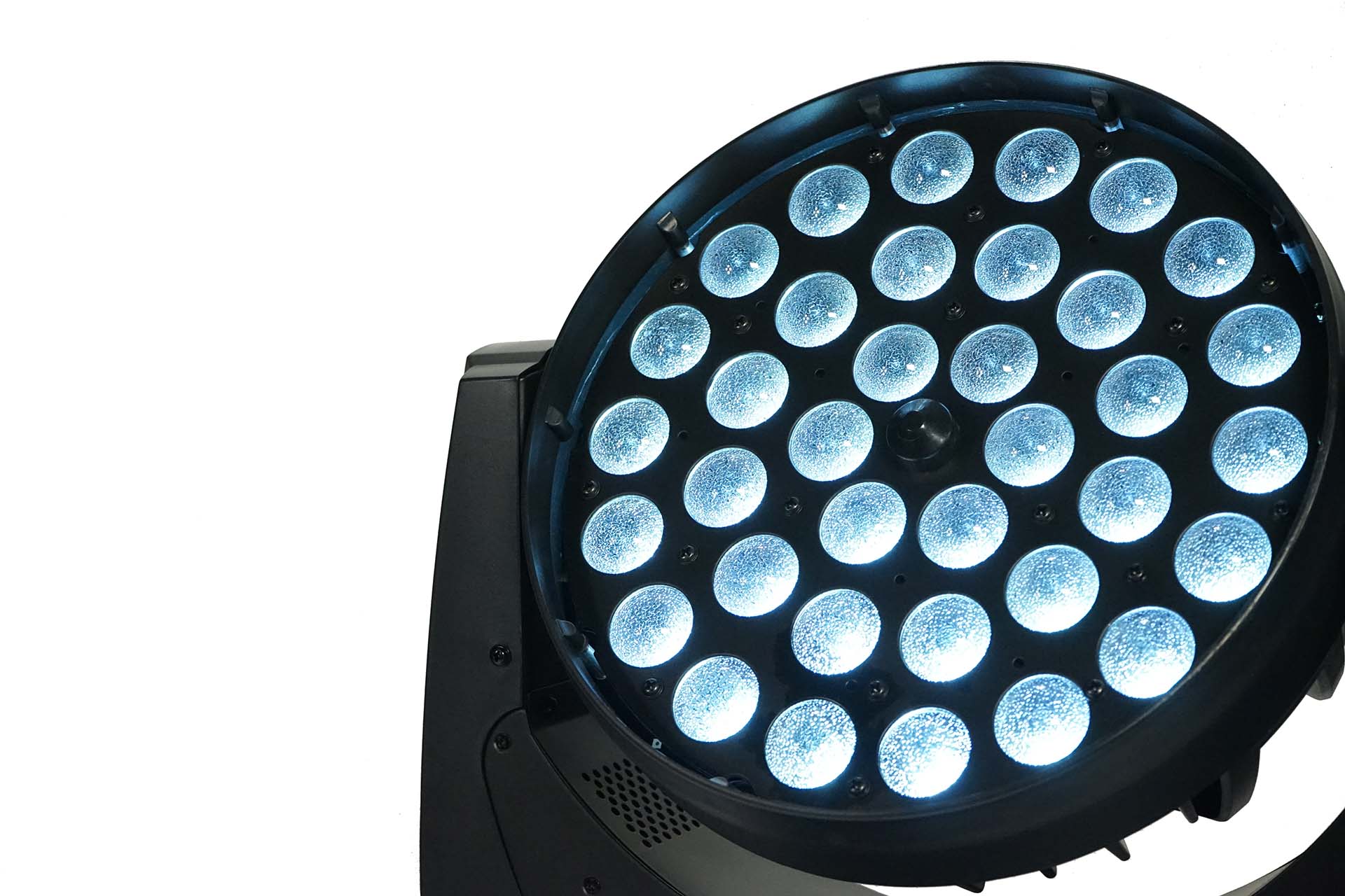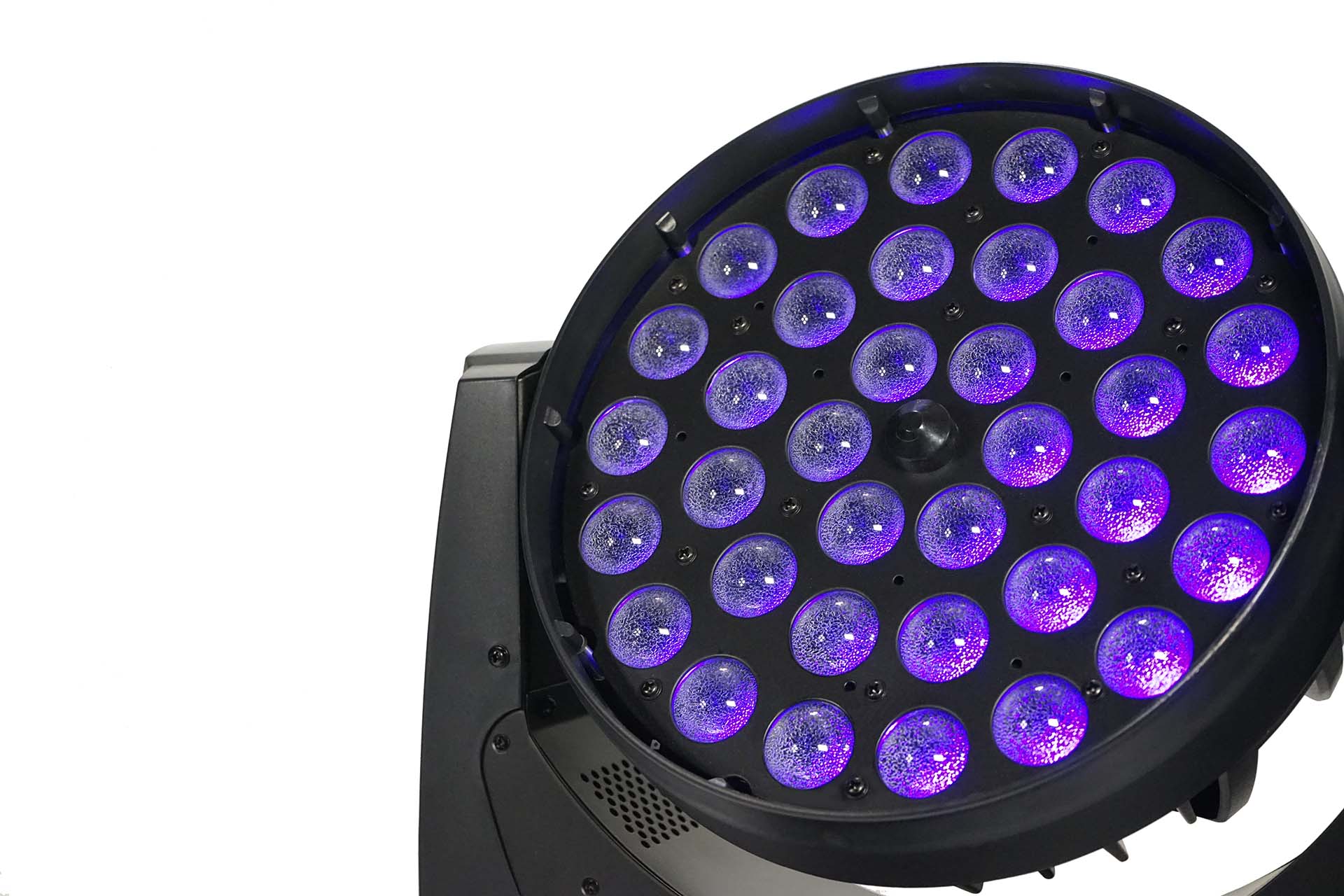 Super Bright Wash Led moving head, 36 RGBWAUV 18w 6in1 Tianxin LEDs RGB-White – Amber – UV, Zoom 15-60�, Preset color macros ,Dimmer: 0-100% , stop/strobe effect 1-25hz, LCD display, 9.5 kg