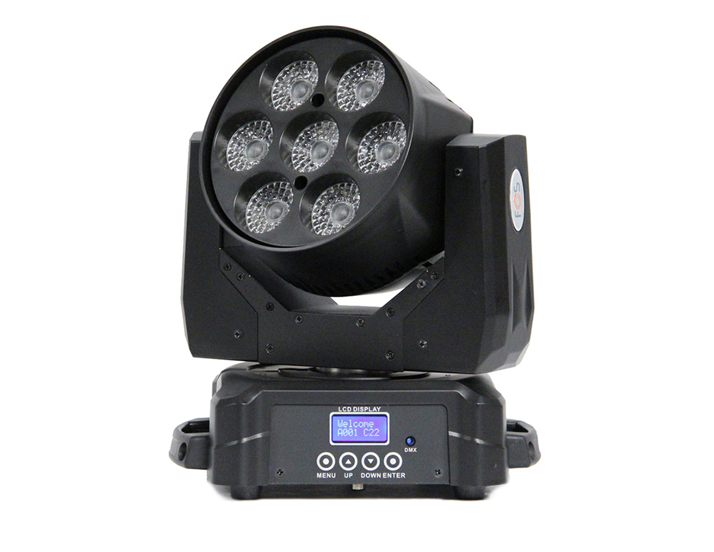 Wash moving head , Zoom 15-50�,7 RGBW 15w 4in1 LEDs, Preset color macros , Pixel Control ,Dimmer: 0-100% linear dimming,stop/strobe effect, 22 DMX channels, 6 kg