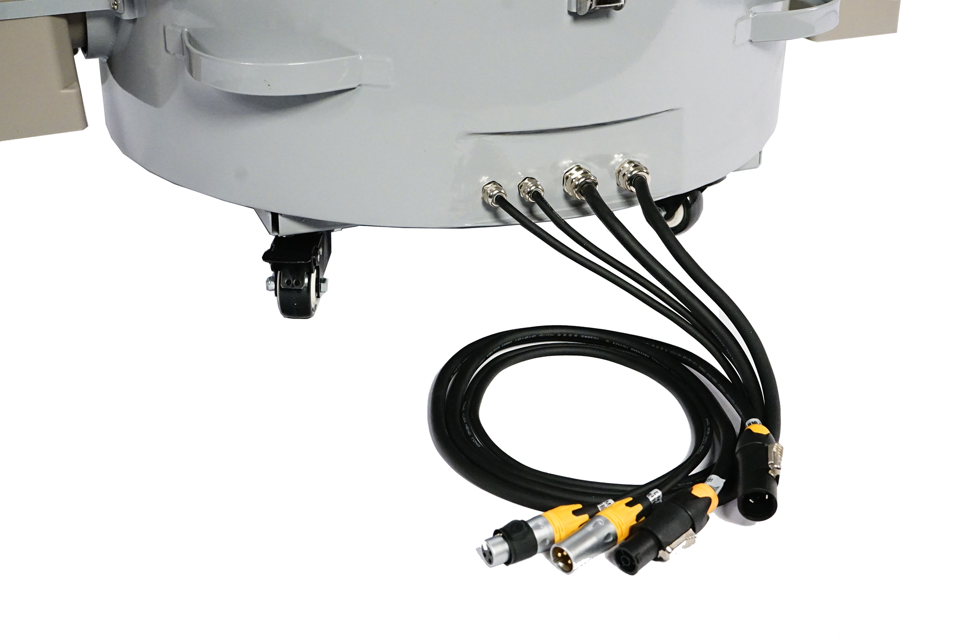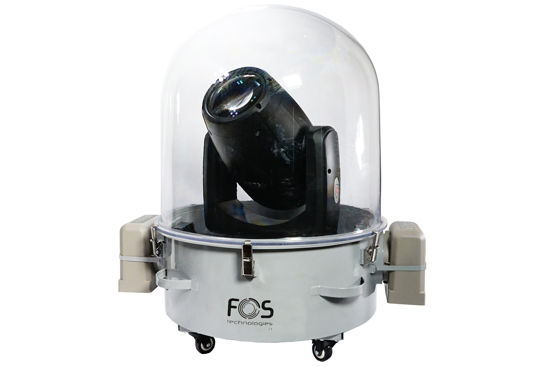 Weatherproof Dome IP54 for moving heads up to 470 watt and height up to 75cm, stainless steel structure with plastic pressure casting covers, heating absorption though fans, true poweron and weather proof XLR in/out.
