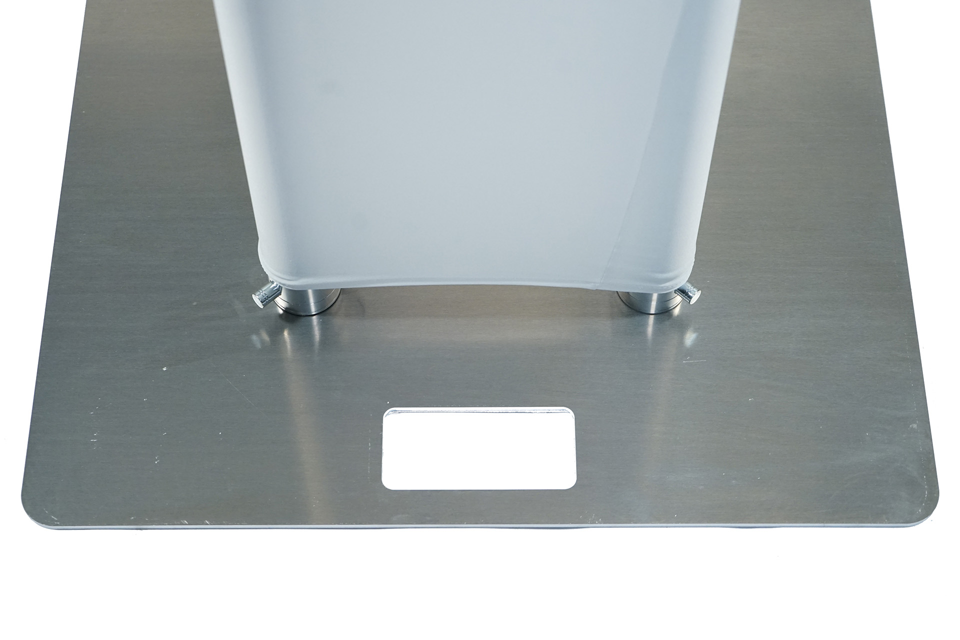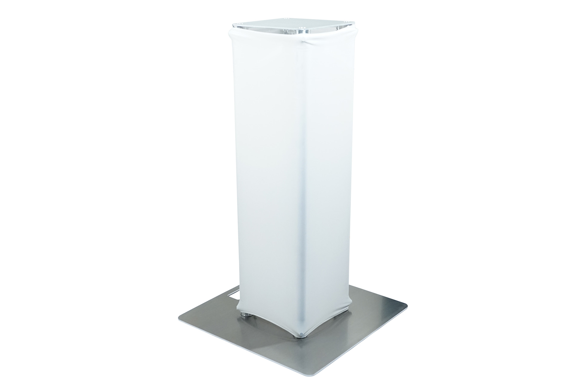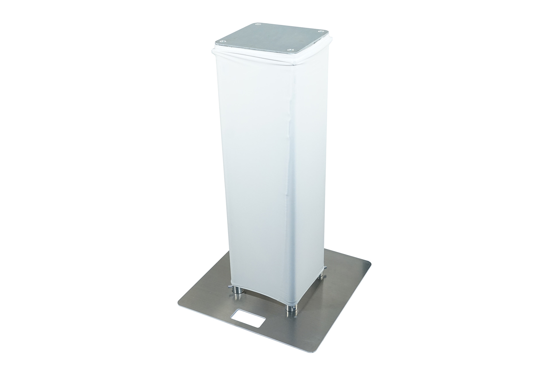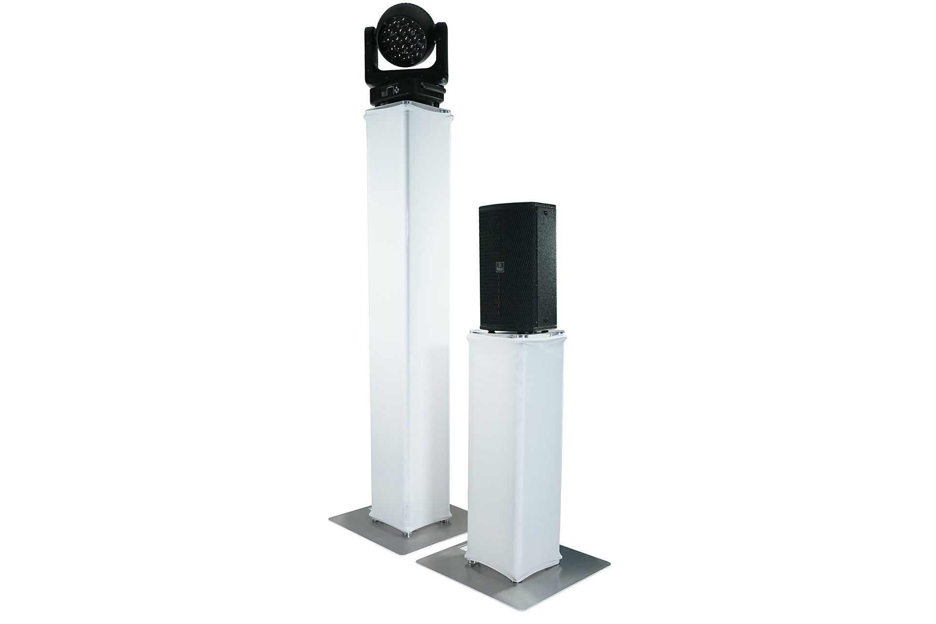 Decorative stand for moving heads or speakers, height 100 cm, max. load capacity: 25kg, includes 4 Connecting pipes, top plate (350 x 350 mm), base plate (600 x 600 mm), and white truss cover.