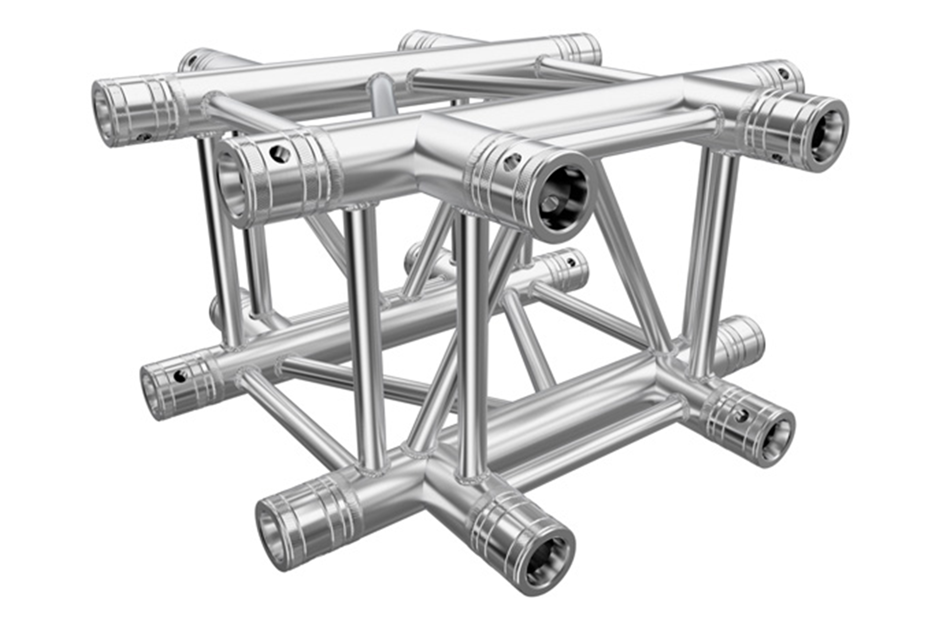 Aluminium truss QUA290A-V1 system 4-WAY 90 degrees corner ,0.5m each side (4x pins, safety clips couplers included). Aluminium EN AW-6082 T6,