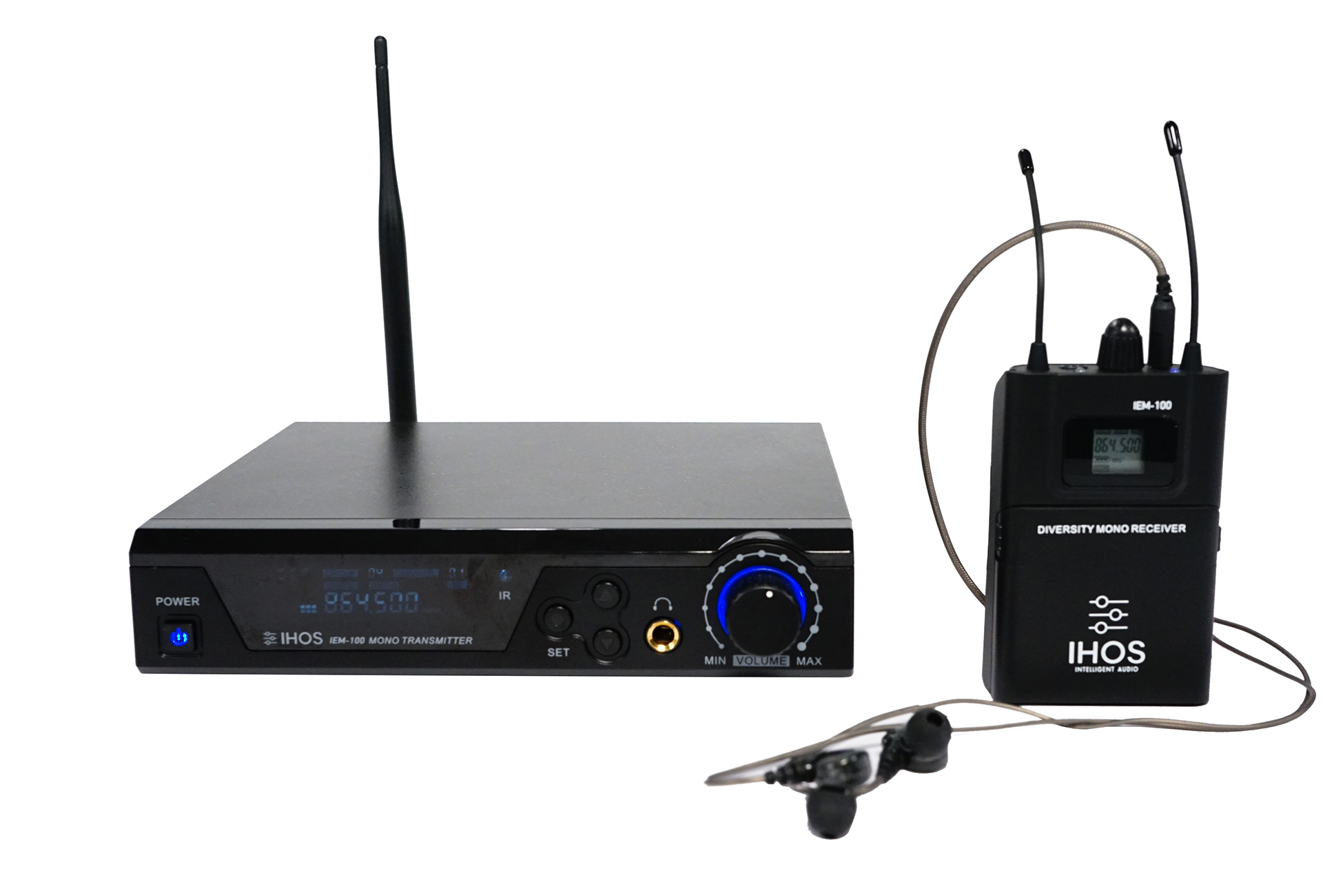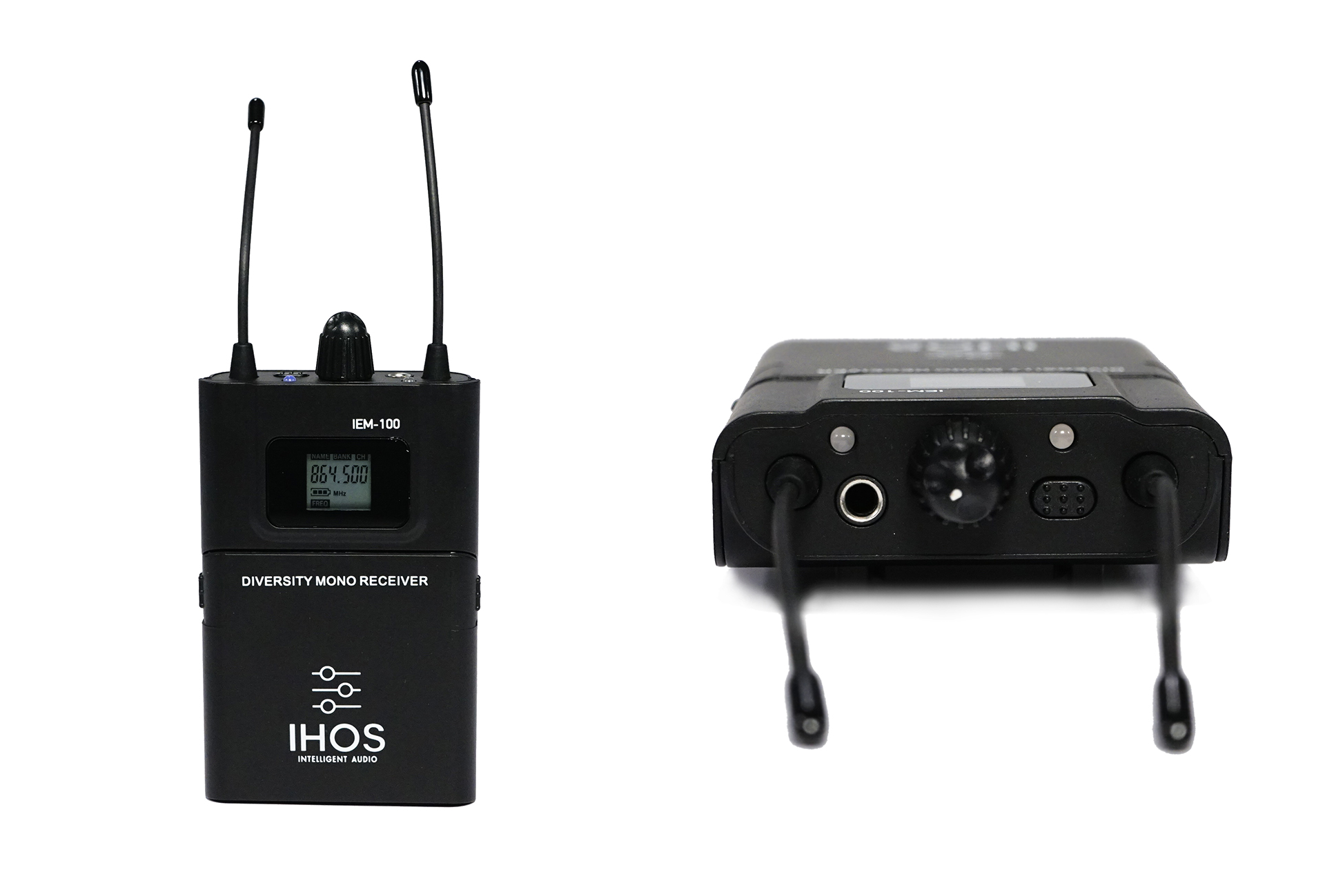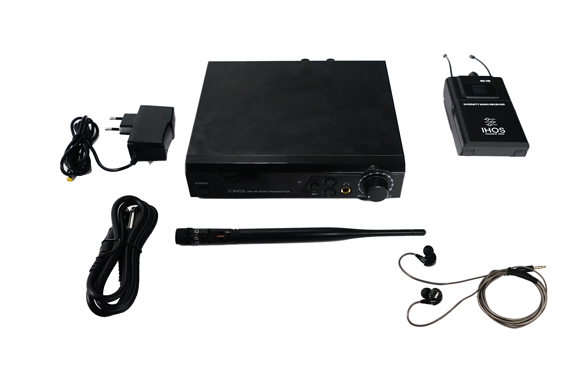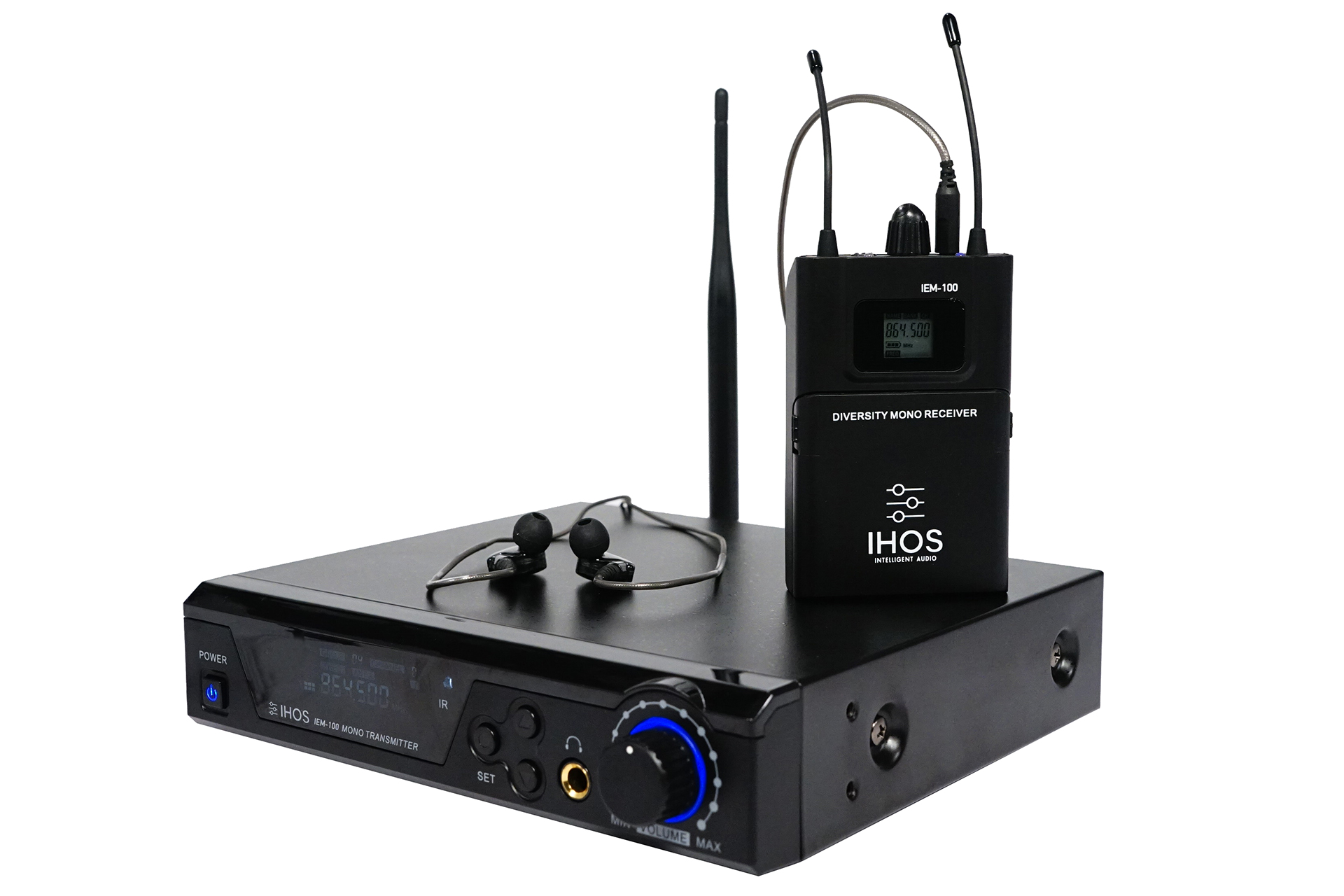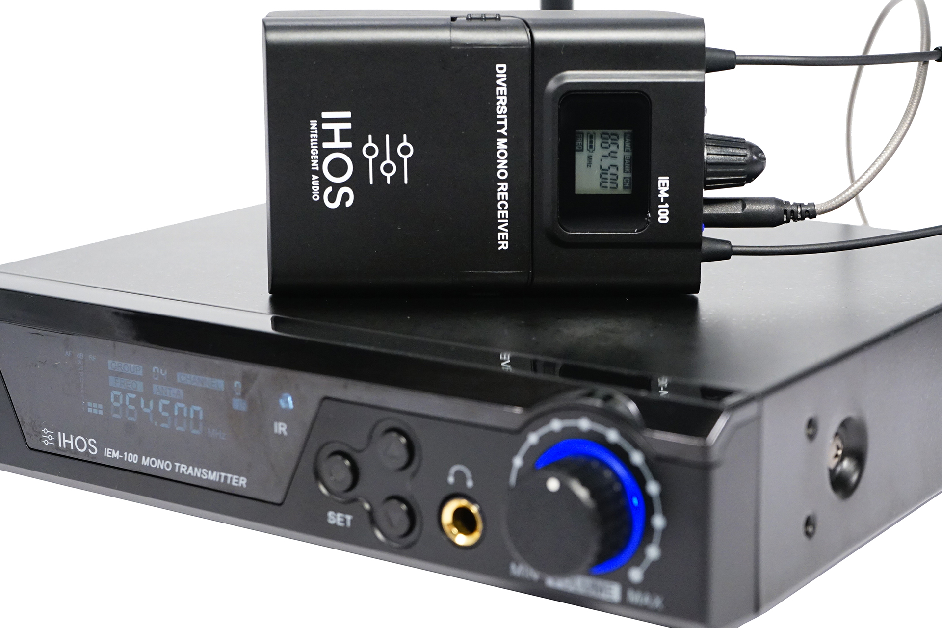 Wireless in ear monitor system, freq. range UHF 863-865MHZ, IR sync downloading the frequency from receiver, LCD display shows the RF level, AF level, channel and frequency, 200m line-of-sight operating range.