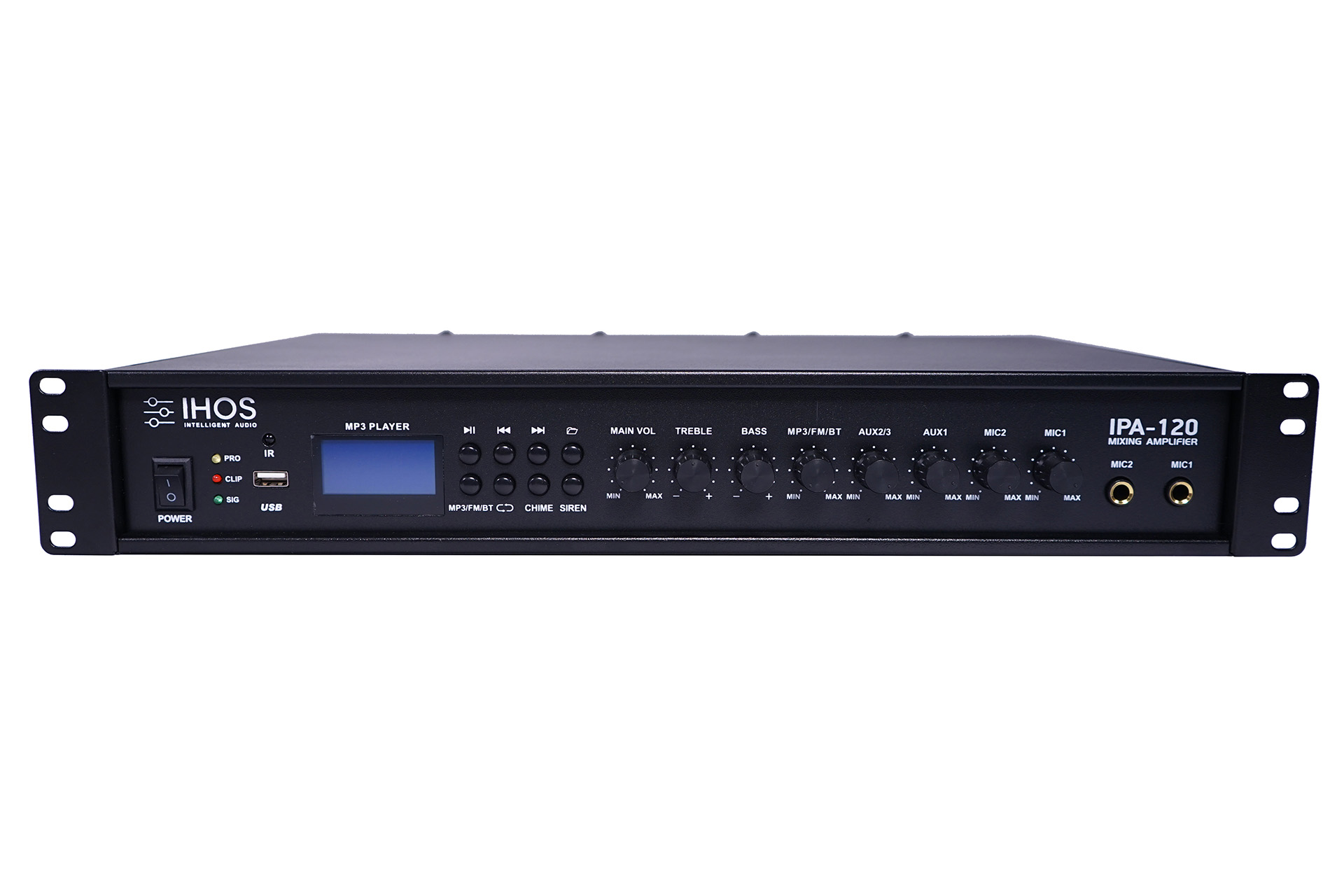 Public Address mixer amplifier 120w , 100V / 70V constant voltage output, 8 ohm constant resistance output, mp3, bluetooth, FM tuner ,USB interface,LCD screen, 3 line input, 2 mic input, 1 line output.Treble and Bass,IR control function