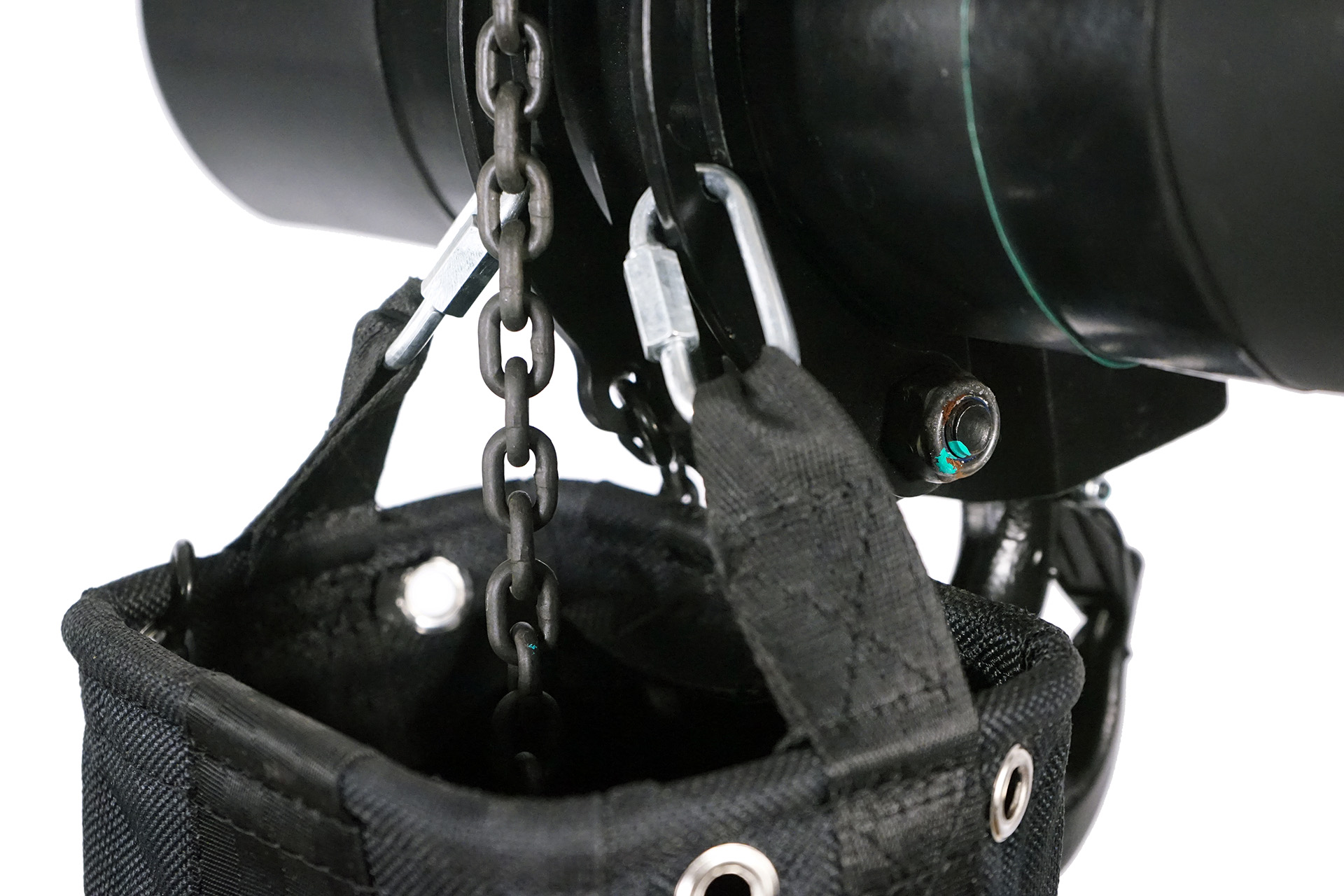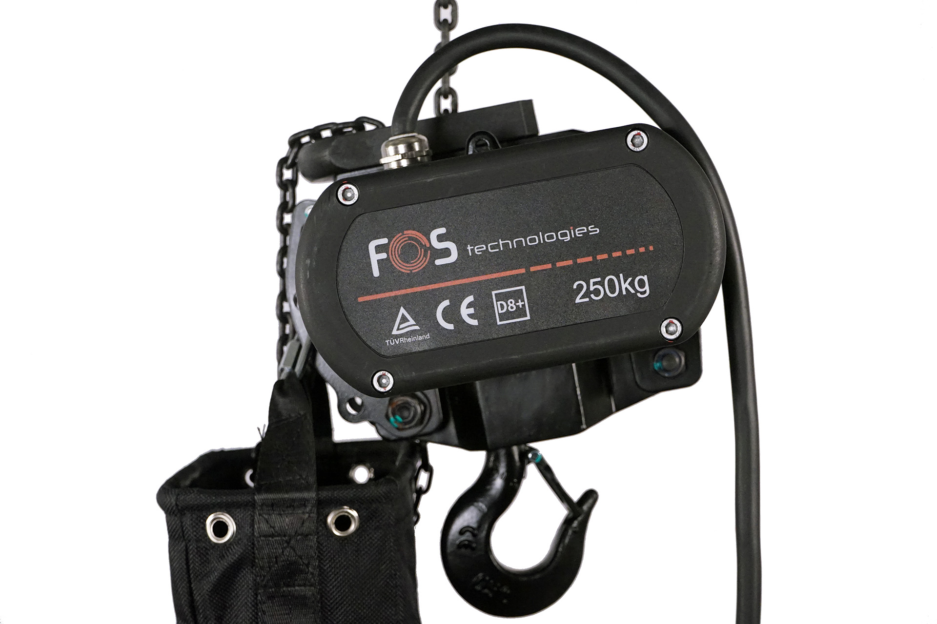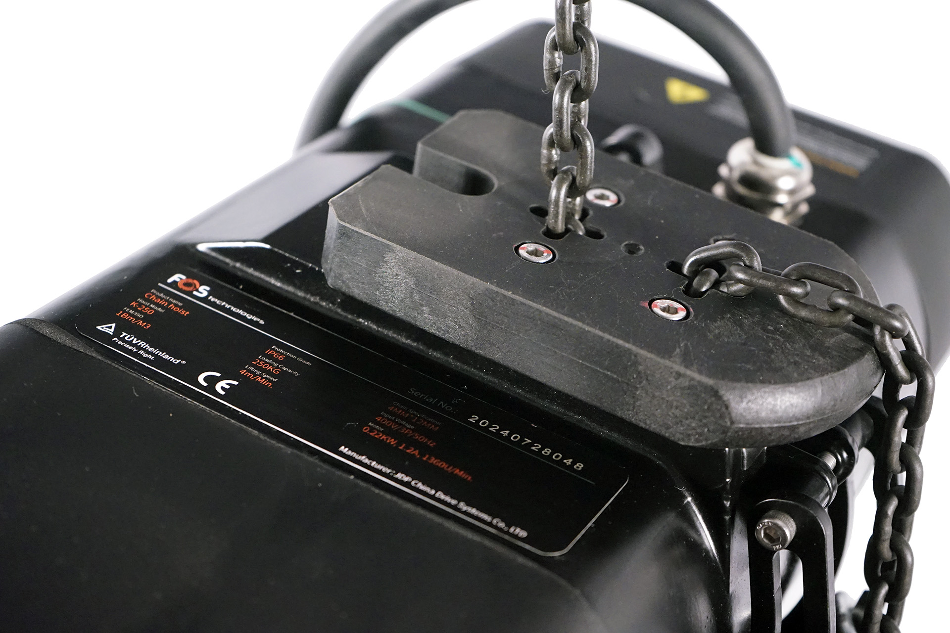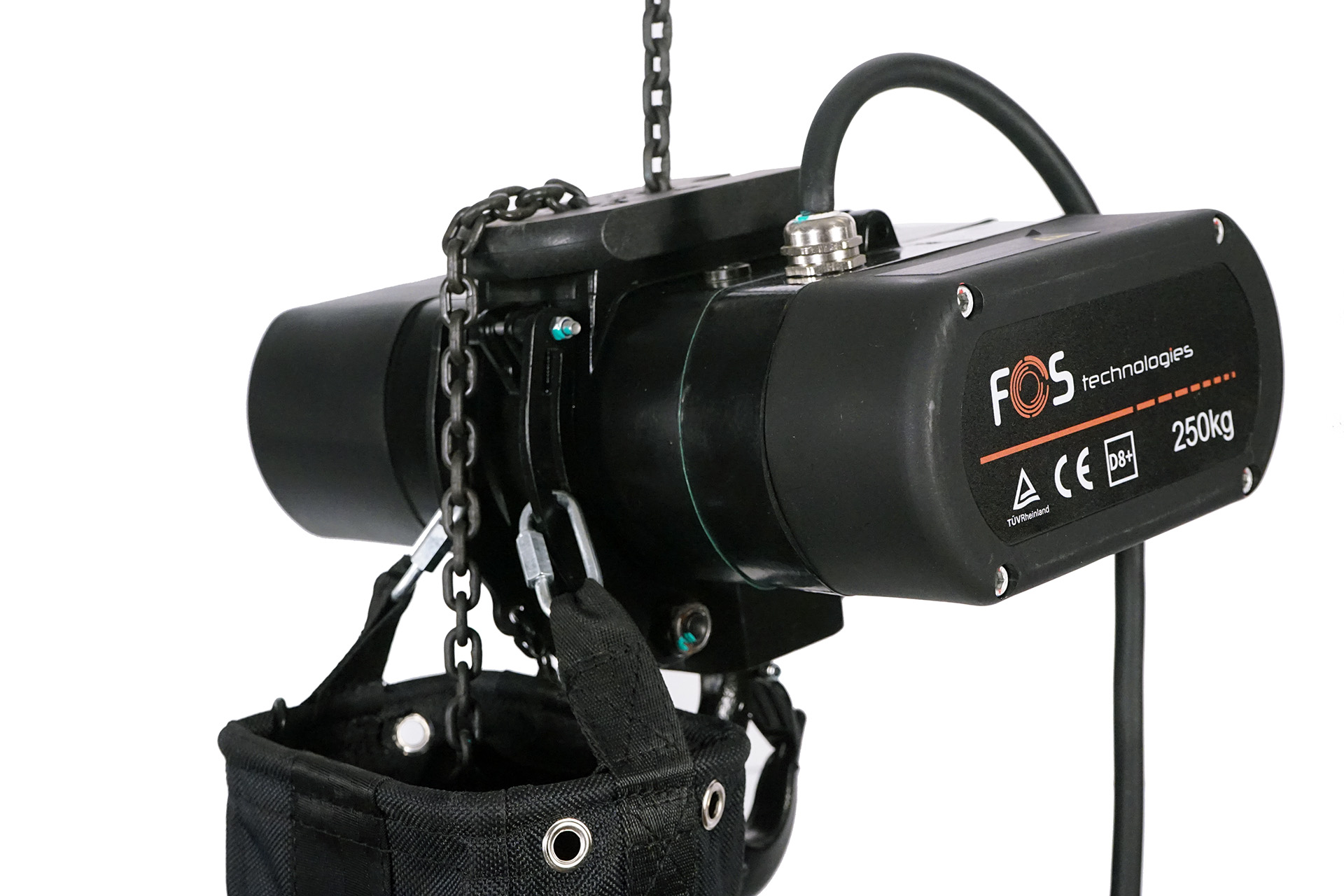 Professional weatherproof electric 250kg chain hoist, D8+ G100 load Chain, compliant with EN818-7, 8 times safety factor, TUV certfied, self-climbing, double brake, overload protection with safety clutch device, direct control, lifting speed 4m/min, chain length 20m, chain bag and hook, low operating noise less than 60 dB, 24 kg.